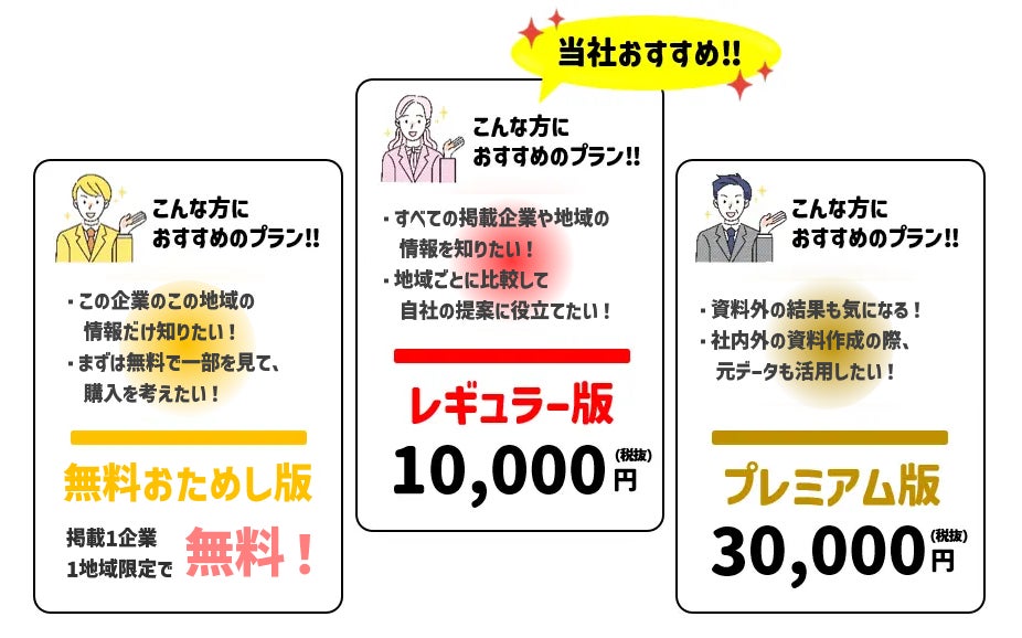 「無料で一部を見て、そこから購入を考えたい!」「資料だけじゃなくて、結果データも欲しい!」等、様々なニーズがあると思いますので、各種購入プランをご用意しました。