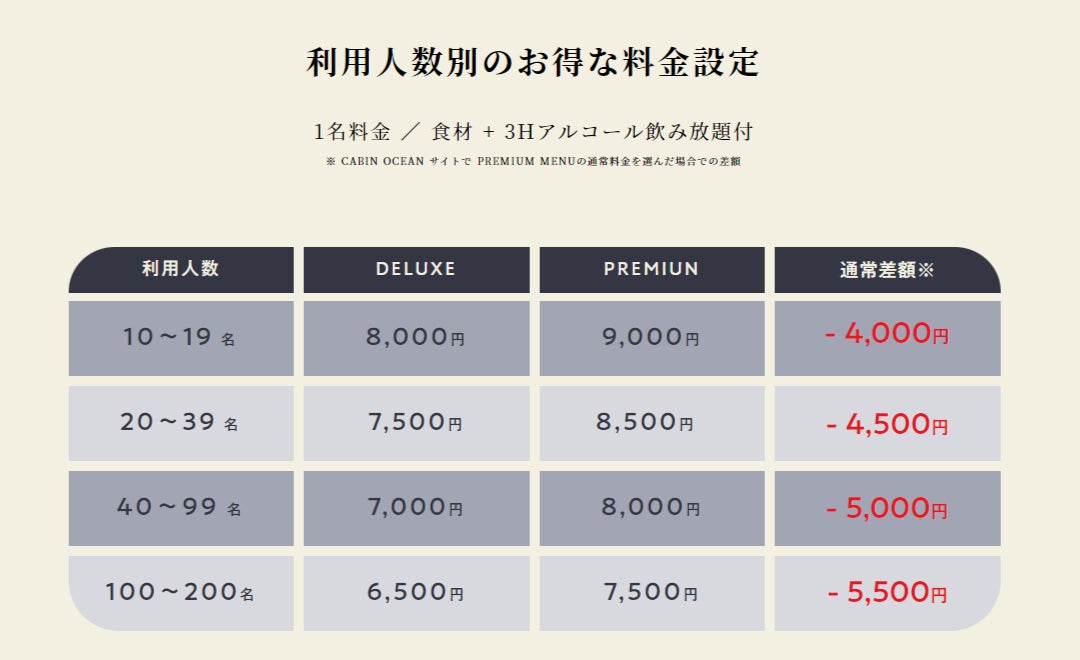 通常BBQメニューとアルコール飲み放題を利用人数に応じて特別価格でご利用いただけます。(6,500円(税込み)/名よりご利用可能。)
