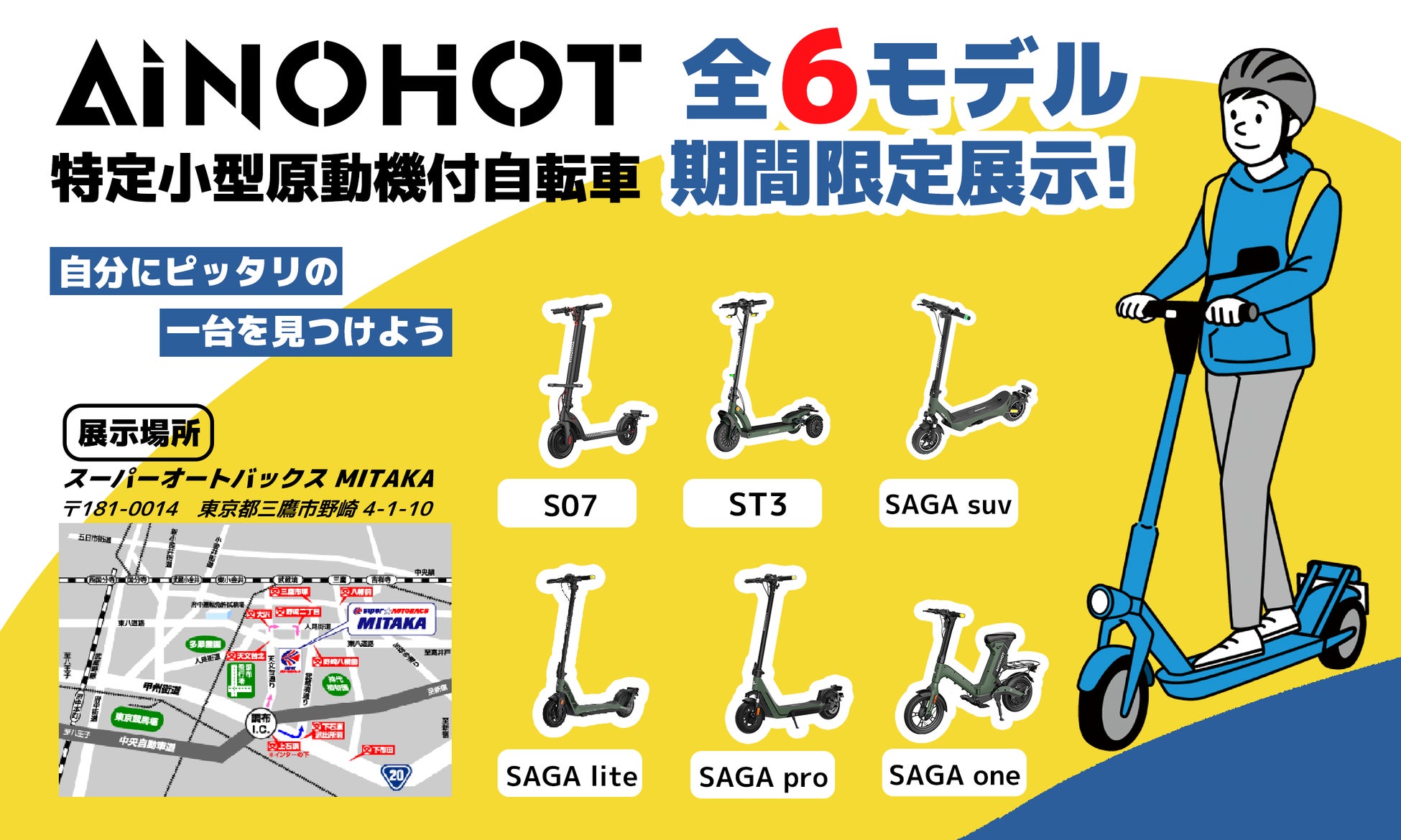 AINOHOT特定小型原動機付自転車、スーパーオートバックスMITAKAで全6モデルを期間限定展示