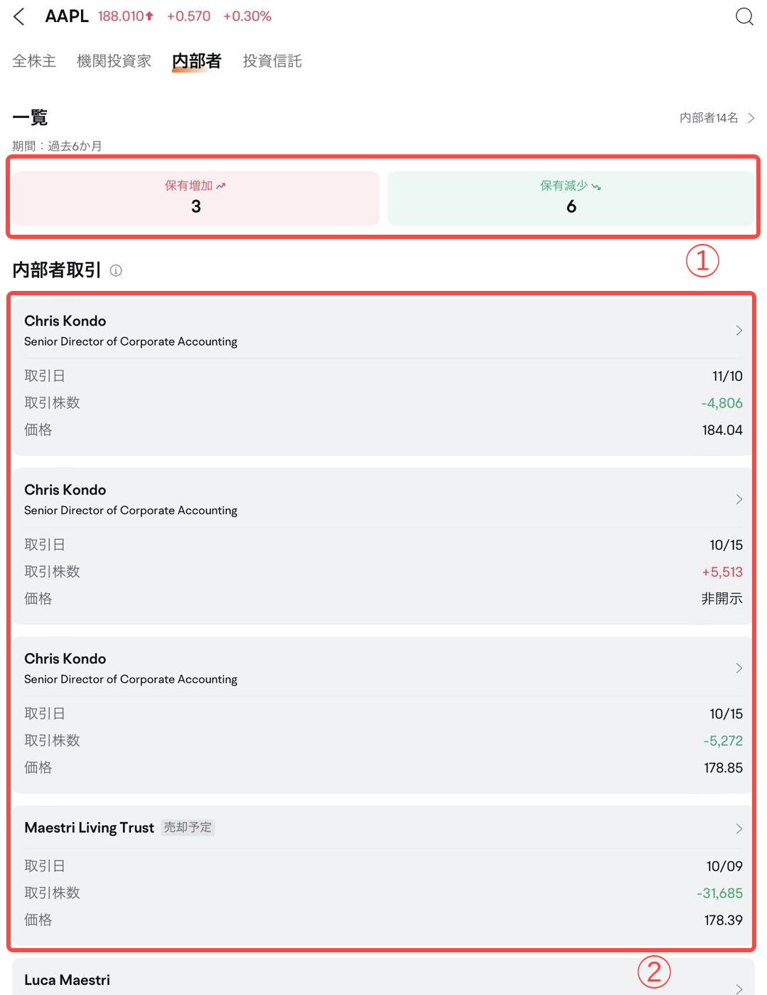 moomoo証券アプリで提供されるのは、内部者(非公開情報にアクセスできる会社役員、取締役、主要株主、その他会社に関連する人物や会社)の取引に関する情報です。内部者が株式を取引する場合、米国証券取引委員会(SEC)へ届け出る必要があります。