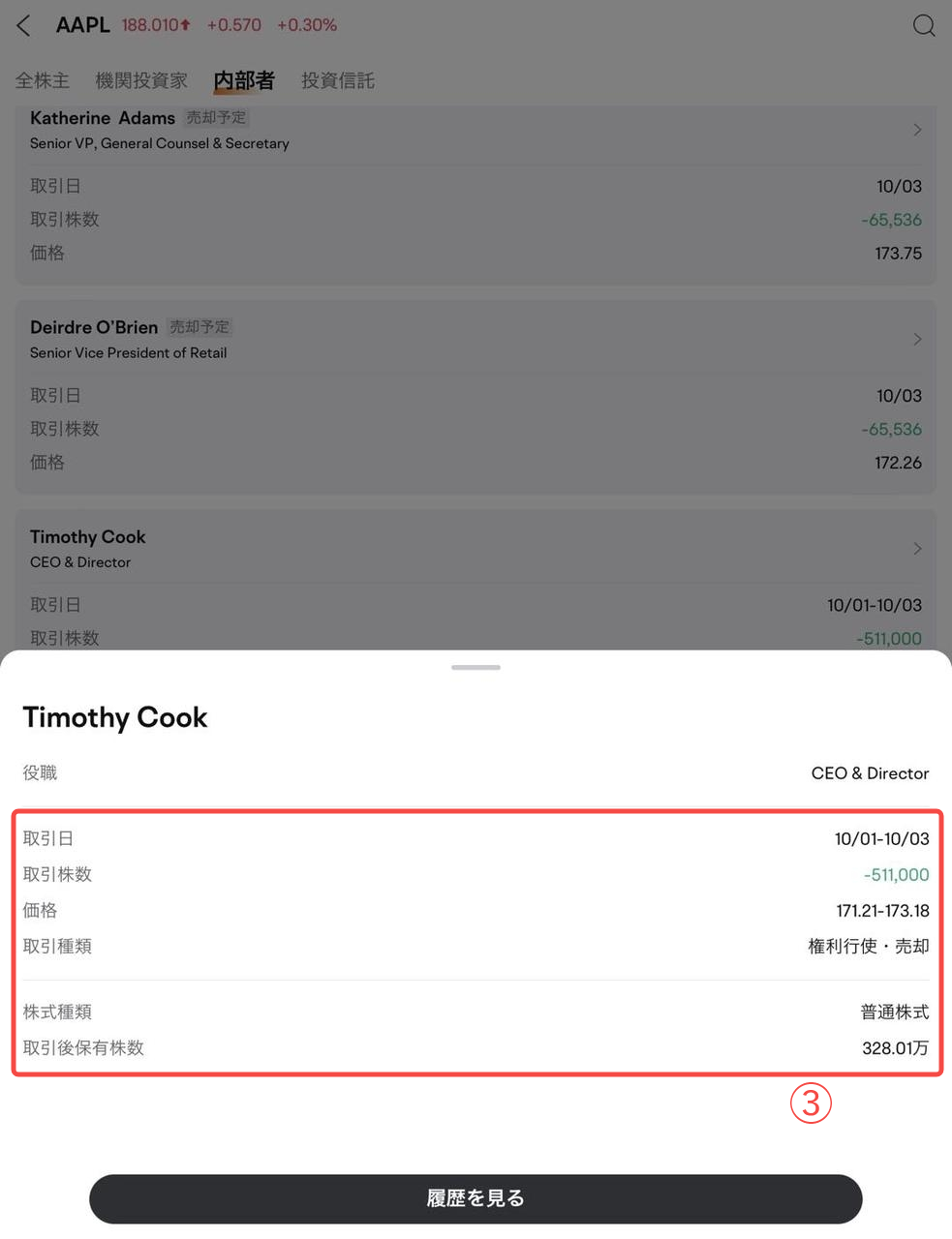③内部者の取引詳細(名前、役職、増減株式数、取引価格、取引日)