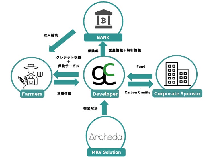 その実現のため、カーボンクレジットで得た資金を活用し、気象変動や生態系の変化によって生じる収穫量・品質の悪化などを補償するマイクロファイナンス(農業保険)サービスを提供します。これにより、農家の経営安定化と温室効果ガス排出量の削減を両立する持続可能な農業の実現、経済・社会・環境の三側面でポジティブなインパクトを生み出す新たなモデルを構築します。