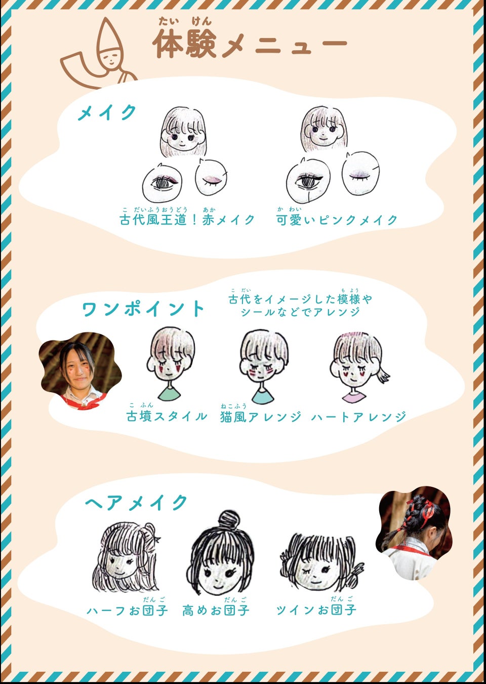 定員:古代ヘアメイク体験は各回先着2名。古代衣装体験は各回先着23名(サイズには限りがあります)