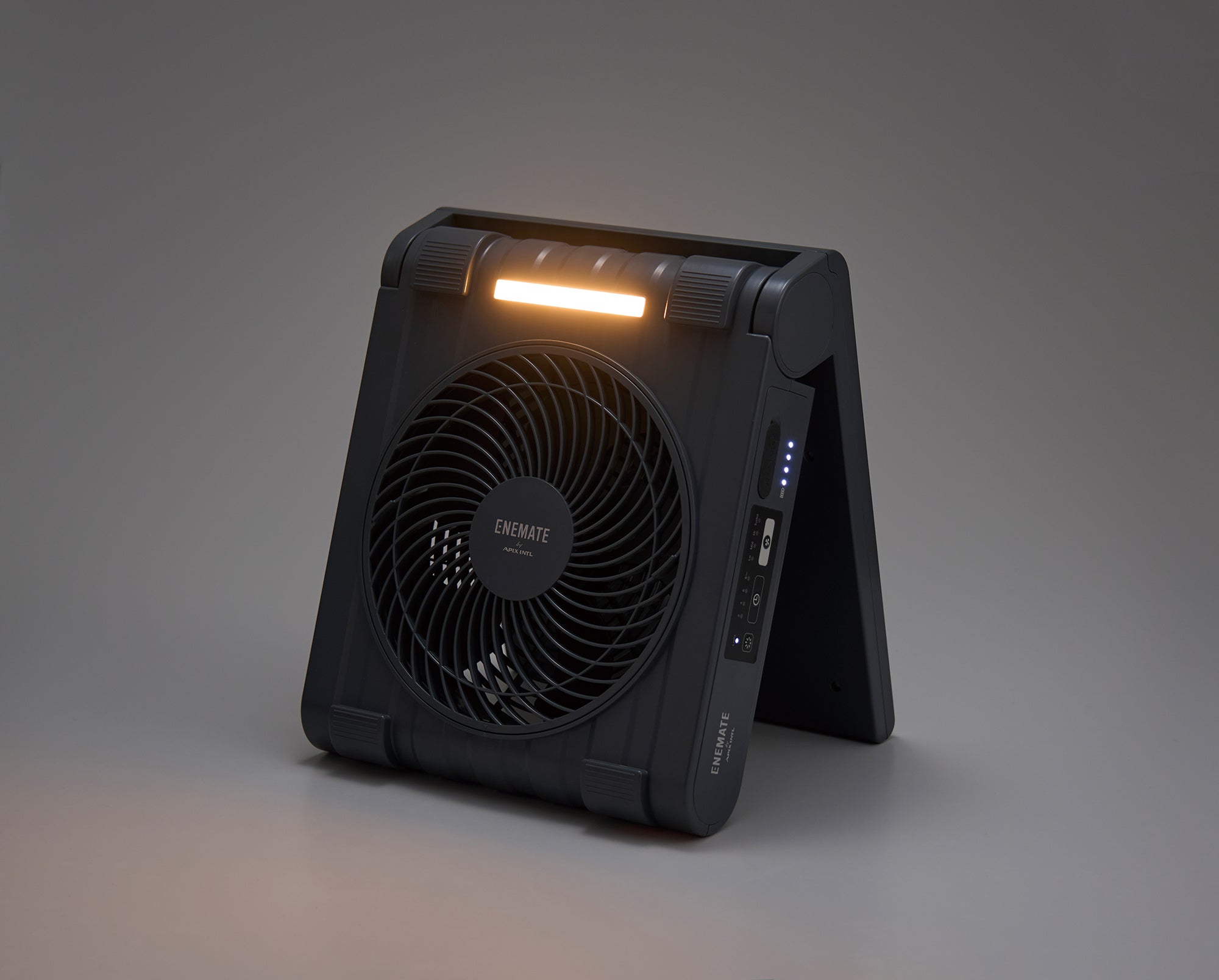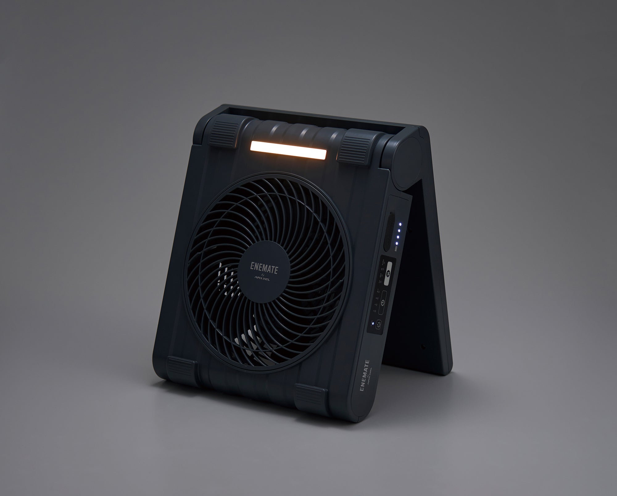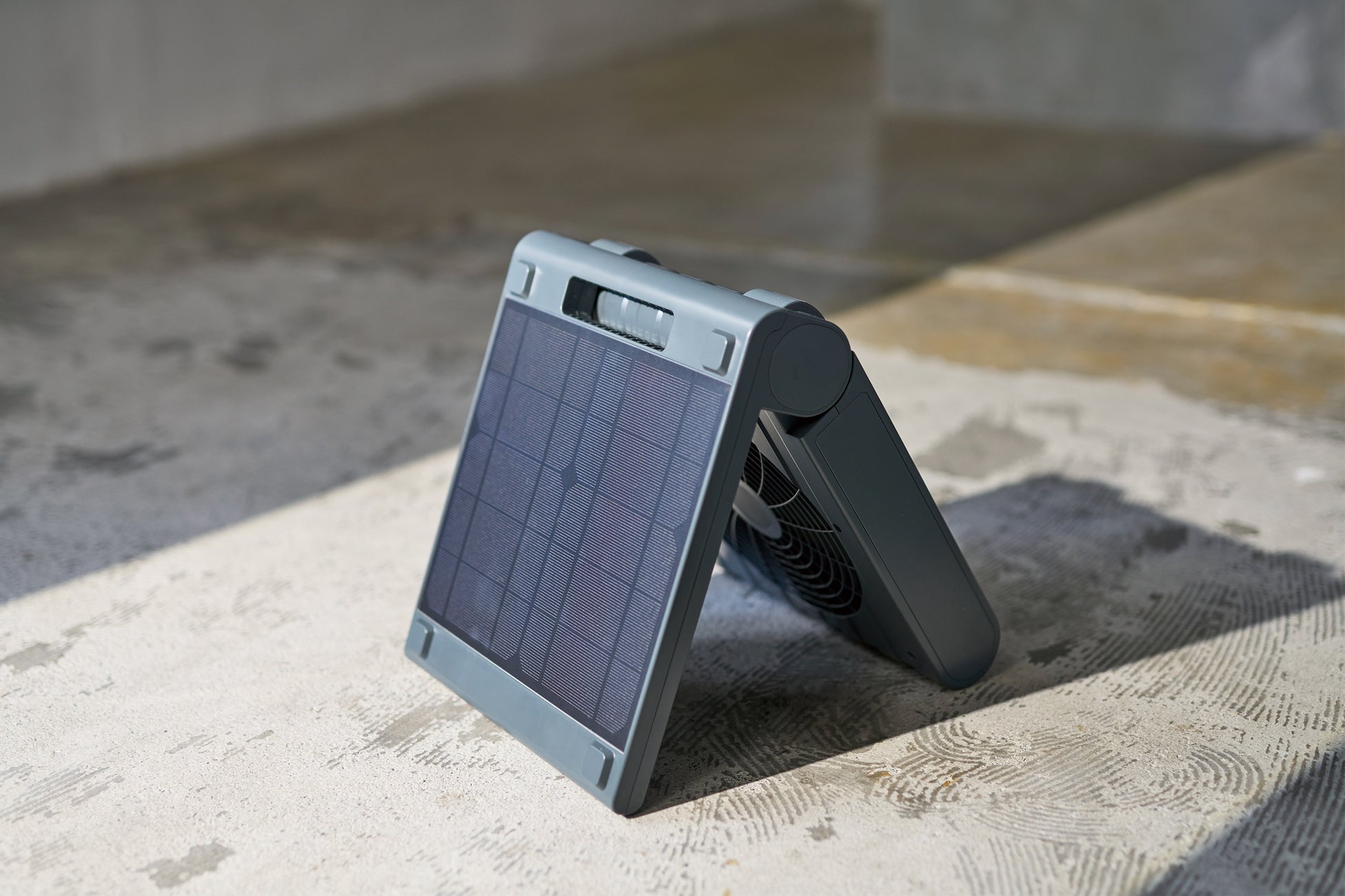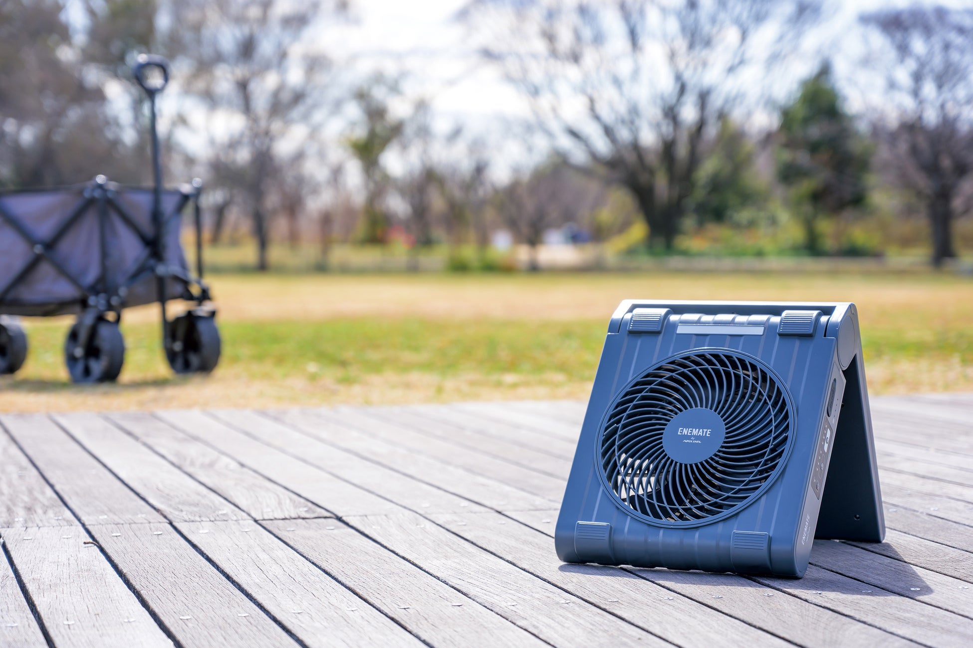 従来から好評をいただいていたソーラーパワーファンがパワーアップし、ENEMATEシリーズに加わりました。ソーラーパワーファンは背面にソーラーパネルを搭載した充電式扇風機で、太陽光で発電し運転します。IPX4相当の防水仕様で、屋外でも使用が可能。折りたたみ式で収納にも困りません。