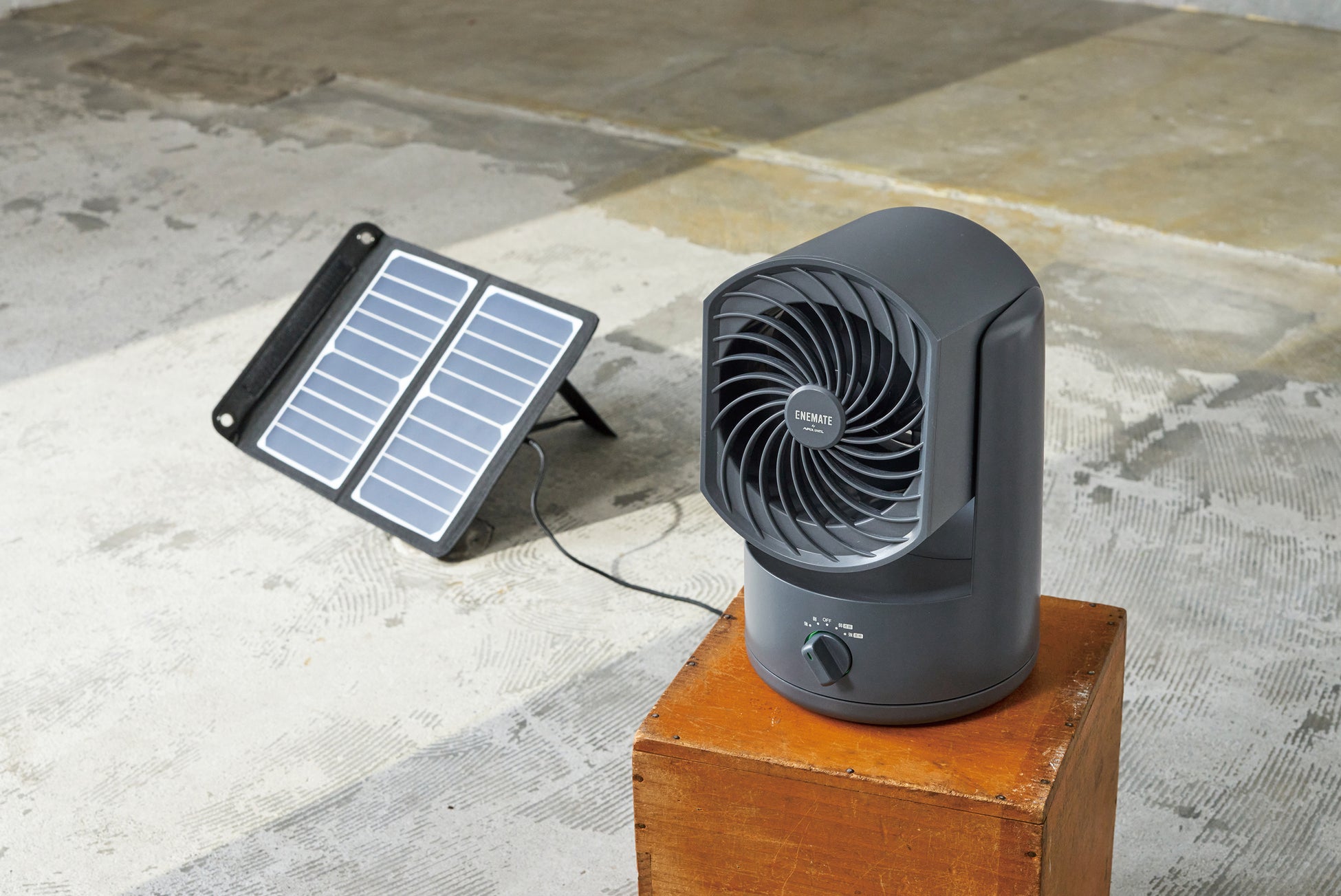 ENEMATEシリーズの「ソーラー充電器 AEC-10W」と組み合わせて使用できるため、電源がない場所や災害時など、いざというときに扇風機の代わりとして活躍します。