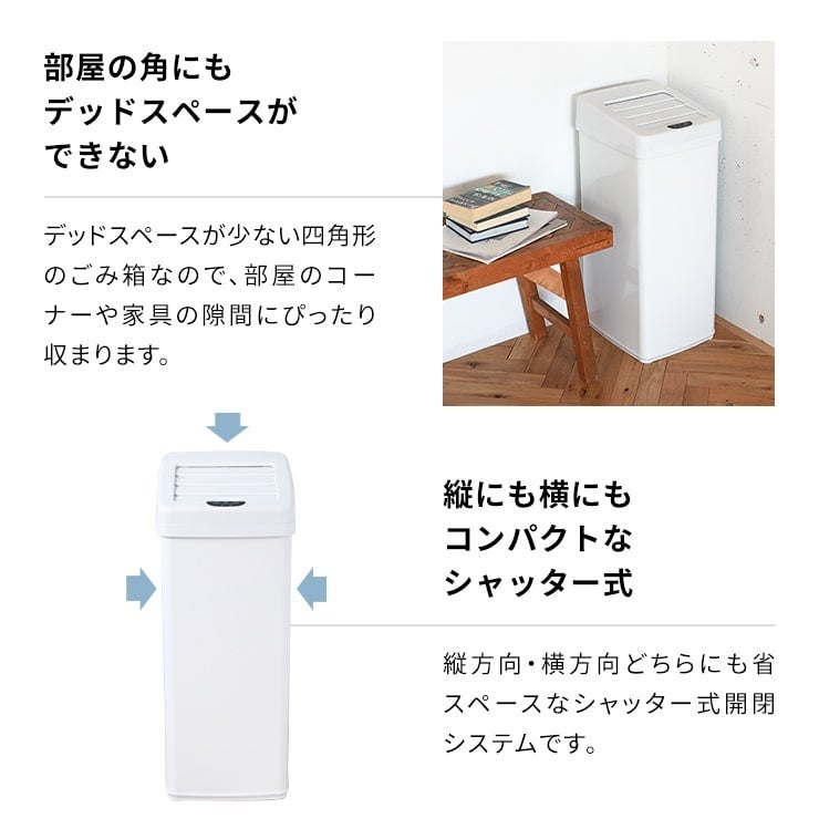 また、一般的な上開きではなくシャッター式横開きのフタを採用することで、ゴミ箱の中の臭いが漏れにくいよう設計しています。