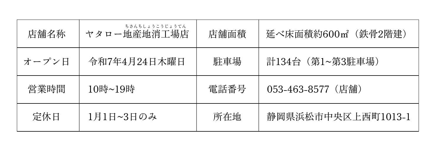株式会社ヤタロー(静岡県浜松市 代表取締役 中村伸宏)は、4月24日㈭に『ヤタロー工場直売店』を移転リニューアルし、『ヤタロー地産地消工場店』を静岡県浜松市中央区上西町にオープンします。