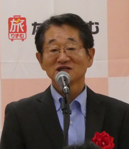 記念式典は、本式典の主催者である株式会社たびりずむ 取締役会長 藤井宏明の挨拶から始まり、続いて、当プロジェクトにご尽力いただいた、元在モンゴル日本国特命全権大使 清水武則様からもご挨拶を賜りました。最後には関係者によるテープカット・記念撮影を行い、大分県からモンゴルに旅立つ多くのお客様に見守られながら、盛大な式典を実施することができました。