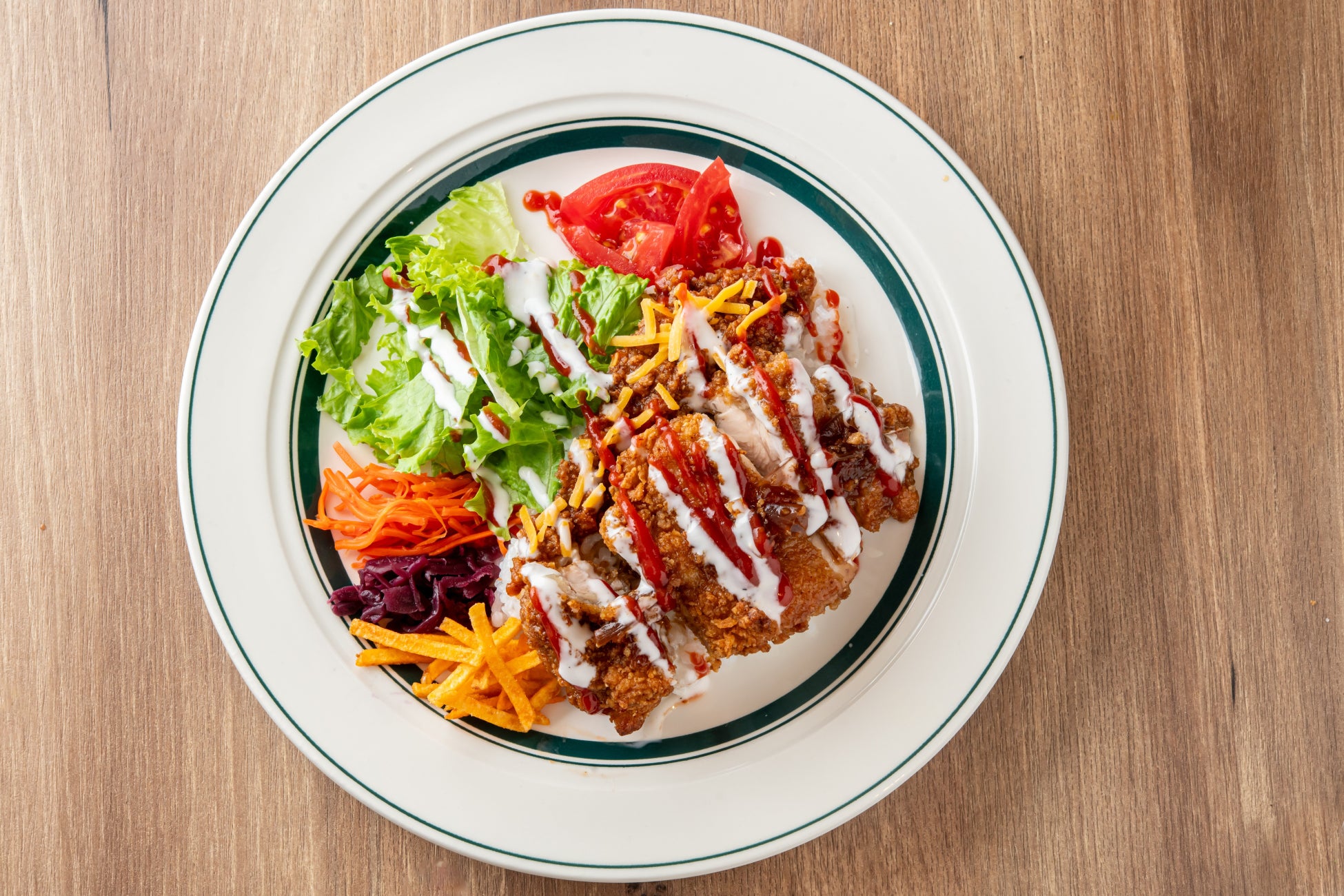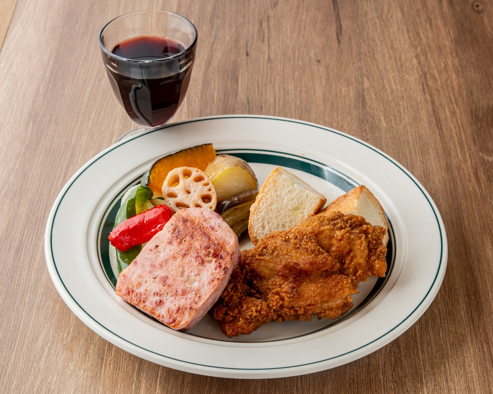 15時以降は、京都にあるシャルキュトリー専門店から仕入れた有名ホテルでも使用されている手づくりプレスハムを使用したハムステーキをフライドチキンに合わせ、季節の野菜とフォカッチャを乗せたディナープレートでワインを合わせて、おひとり様やカップルでのお食事にも使えます。