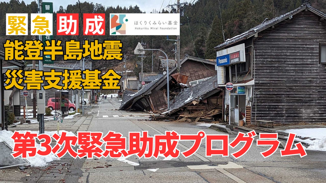 令和6年1月1日に発生した令和6年能登半島地震の甚大な被害を受け、公益財団法人ほくりくみらい基金(所在地:石川県金沢市、代表理事:永井三岐子)は、石川県域のコミュニティ財団として「令和6年能登半島地震 災害支援基金」を立ち上げ、2月9日(金)12:00より第3次緊急助成プログラムの公募を開始いたしました。