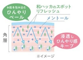 和ハッカのひんやり感を持続させるためにロングキープ処方を採用しています。まず「和ハッカのスポットリフレッシュ」自身が肌の表面で薄い膜となることで、メントールが逃げるのを防ぎ、ひんやり感を向上させています。またメントールを取りこみ、少しずつ角層に浸透することで、ひんやり感をさらに持続させています。