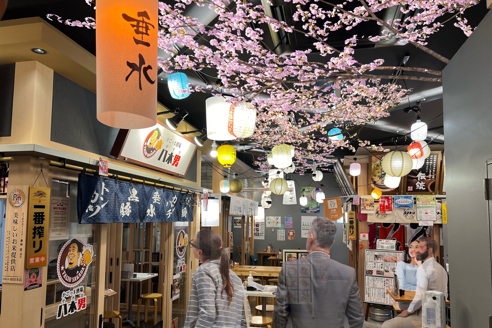 「バスチカ花見村」のメイン企画として、屋台村の天井の一部に桜の花を装飾します。装飾する桜の花の数は、約10万輪。 天気も、寒さも、花粉にも悩むことなく、地下だからこそ楽しめるインドア花見体験を楽しむことができます。