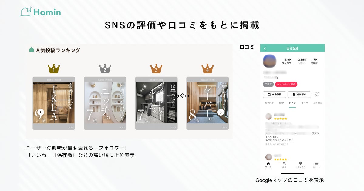 「Homin」は、全国の住宅会社と家づくりを検討するユーザーを繋ぎ、本当に良い住宅会社に出会えるポータルサイトとして、公平性を重視しています。