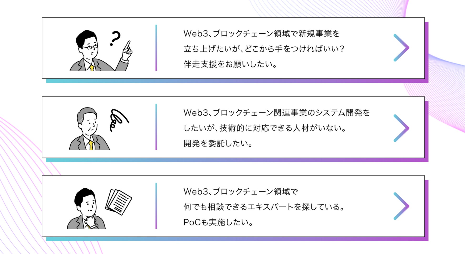 「Bunzz for Enterprise」は、アジア最大級のweb3アプリケーション開発インフラ「Bunzz」が提供する、企業向けWeb3/ブロックチェーン関連事業のシステム開発支援サービスです。下記のような課題をお持ちの企業様に最適です。