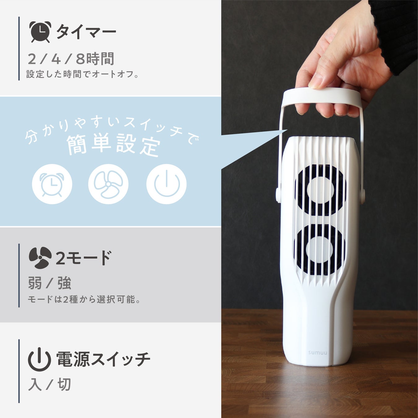 モードは弱/強の2モードを搭載し、シーンに合わせて選択可能です。他にもタイマー機能(2/4/8時間)やマイナスイオン発生機能(※3)、アロマを楽しめるアロマパッドなどが付いています。