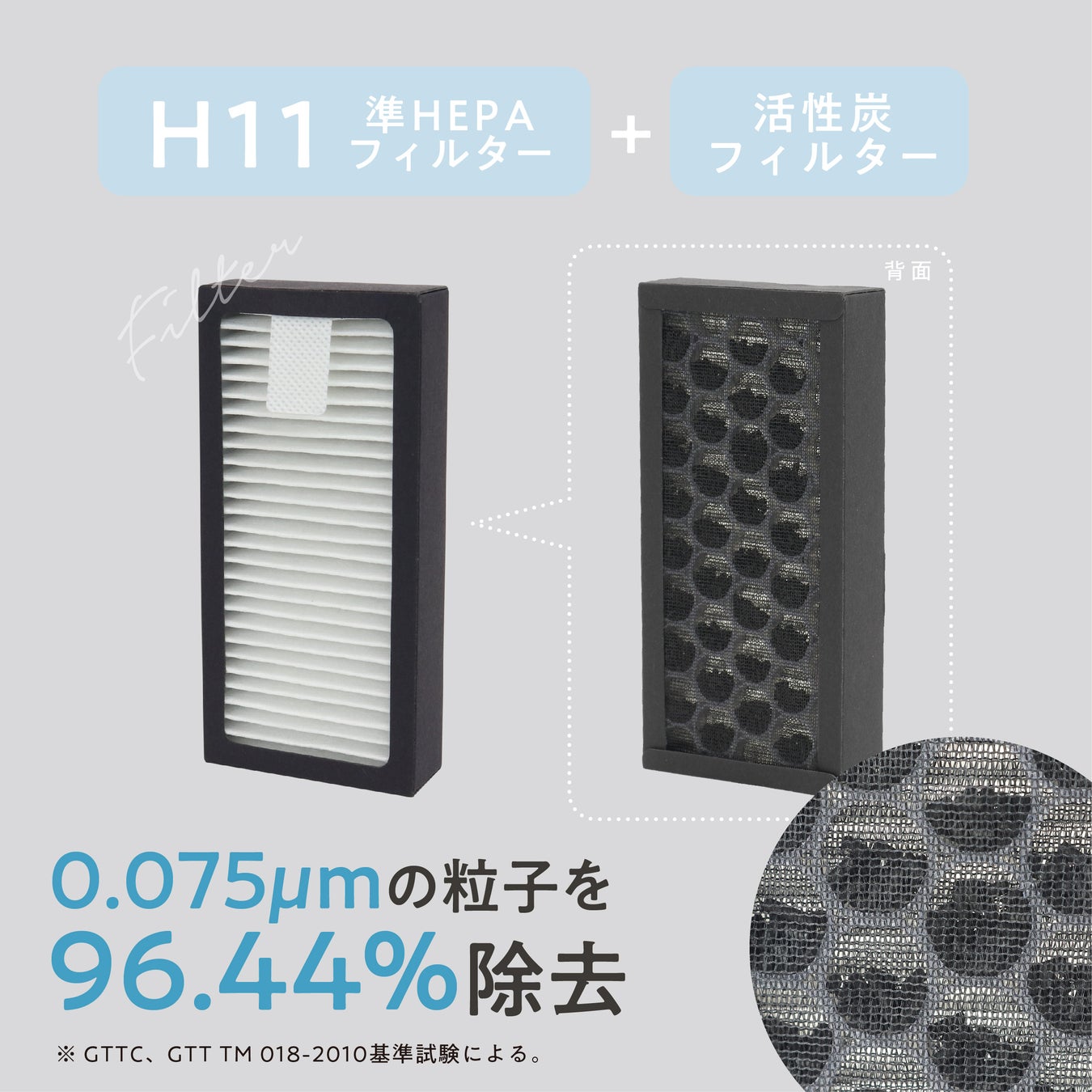 アクウは0.075μmの粒子を96.44%除去(※1)するH11 準HEPAフィルター+活性炭フィルターを搭載した充電式空気清浄機です。準HEPAフィルターで、ほこり、花粉、煙、PM2.5などを除去、活性炭フィルターで、生活臭を除去します。清浄空気供給量は32.93㎥/hで、1時間に8.86畳分の綺麗な空気を供給(※2)することができます。