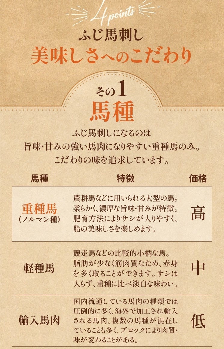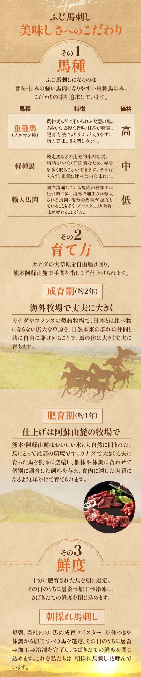 馬刺しの本場 熊本で拠点を構える株式会社フジチク(本社:熊本県菊池郡 代表取締役社長 藤本 健)は、会社の隣で隣接された肥育場で飼育された赤身 馬刺しと国内で流通している