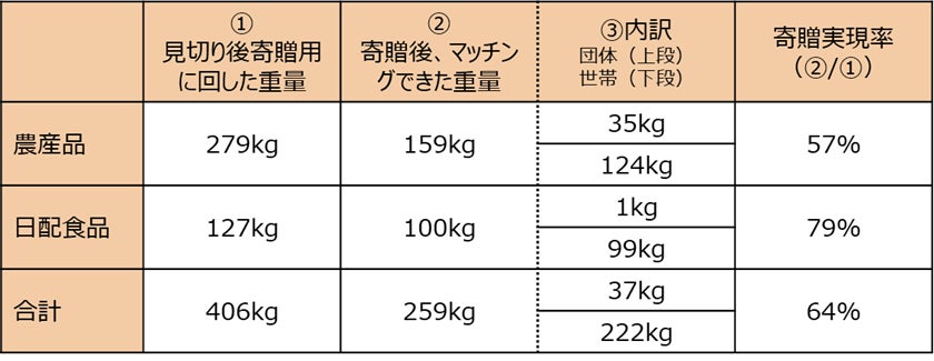 実証実験期間の約2か月間(55日間)で、農産品(野菜・果物)約159kg(856点)、日配食品約100kg(412点)の合計約259kg(1268点)の食品を寄贈しました。