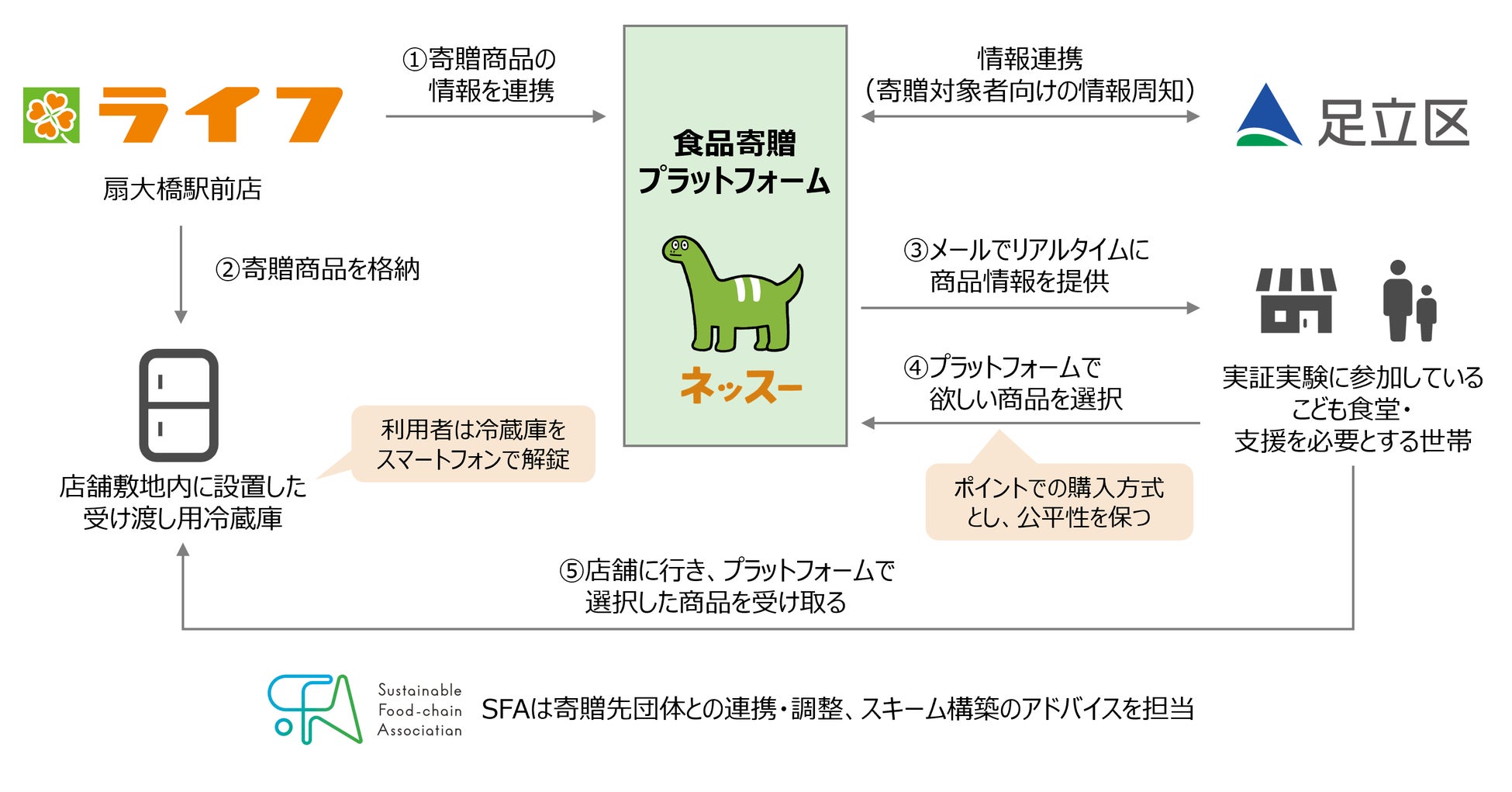 こどもの機会格差の解消を目指すネッスー株式会社(本社:東京都世田谷区、代表:木戸優起)は、“おいしい” “ワクワク” “ハッピー” をお届けする株式会社ライフコーポレーション(本社:東京都品川区、代表取締役社長執行役員:岩崎 高治)および、一般社団法人サスティナブルフードチェーン協議会(所在地:東京都千代田区、代表理事:入江満美、以下SFA)と連携し実施をした、農産品(野菜・果物)・日配食品寄贈モデルの実証実験が終了したことを報告いたします。