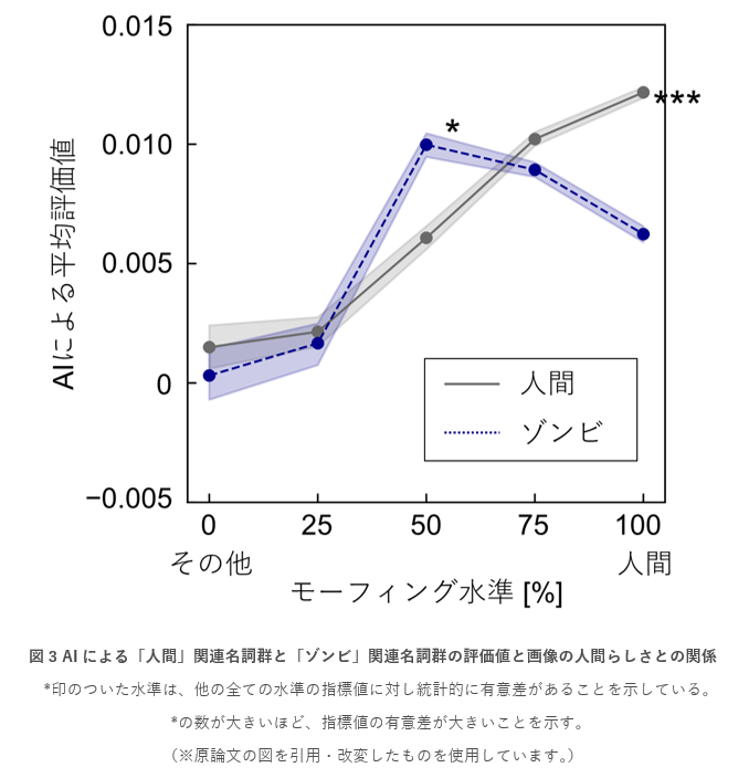 第2の実験では、SD法で用いられた形容詞の代わりに、「人間」に関連する名詞群と、不気味の谷の代表的な例として挙げられる「ゾンビ」に関連する名詞群を、それぞれ30語用意しました。そして、第1の実験同様、モーフィング画像とこれらの名詞群の意味の一致度をAIで解析しました(図3)。その結果、「人間」に関連した名詞群は、画像の人間らしさが高まるほど、一致度が上昇することが確認されました。一方、中間のモーフィング水準の画像で、「ゾンビ」に関連した名詞群との一致度が最大となりました。すなわち、中間のモーフィング水準の画像が、不気味なキャラクターとよく対応するとAIは判定したことを示しています。