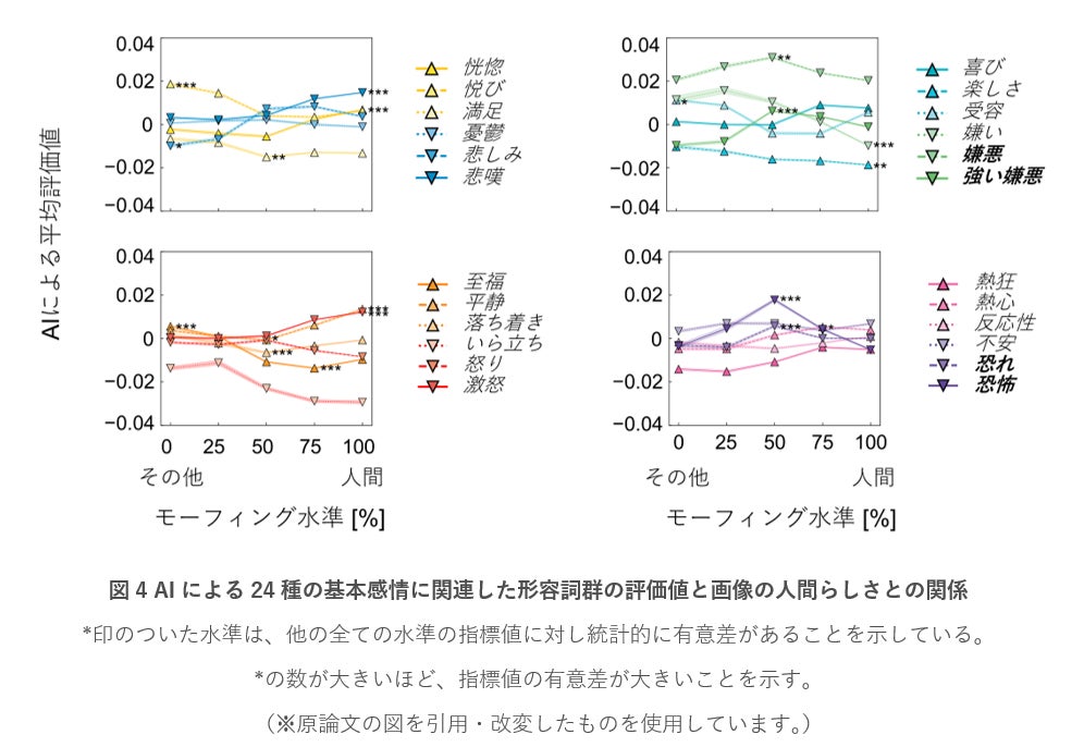 最後の実験では、感性研究(Susanto et al., 2020)[2]で提案されている24種類の感情カテゴリに含まれる形容詞群(全630語)を用いました。その結果、「嫌悪」「強い嫌悪」「恐れ」「恐怖」といった「不気味さ」と密接に関連するネガティブな感情カテゴリとの一致度が、中間のモーフィング水準で最大となることが明らかになりました(図4)。
