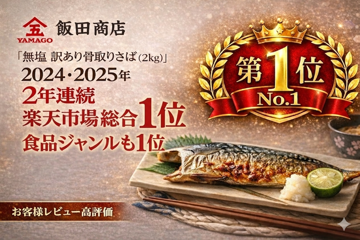 その結果、飯田商店の「無塩 訳あり骨取りさば」は、楽天市場年間総合ランキングにおいて2024年・2025年の2年連続1位を獲得するという快挙を達成しました。
