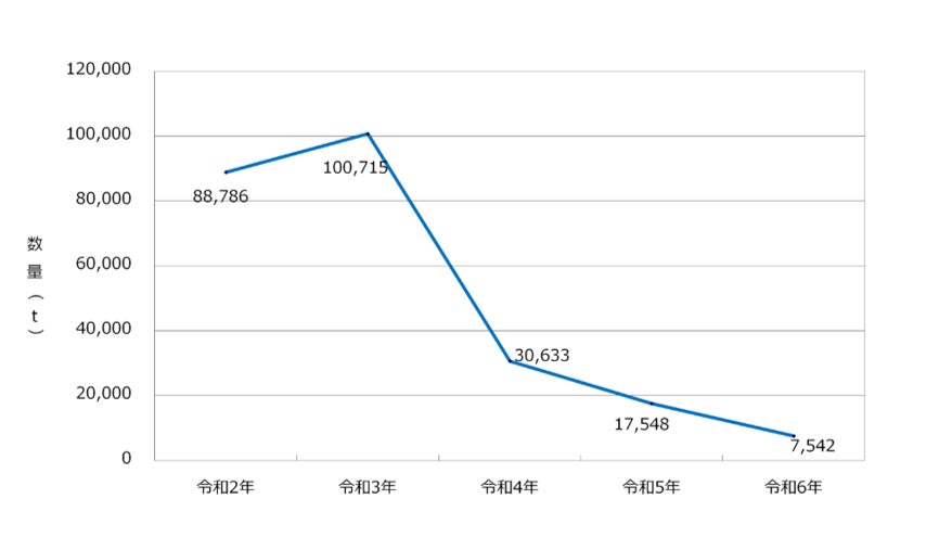 国内の状況も深刻で、日本有数の水揚げ量を誇る千葉県銚子漁港では、サバの水揚げ量が令和3年の約10万tから、直近では約7,500tへと1/13以下に激減しています。