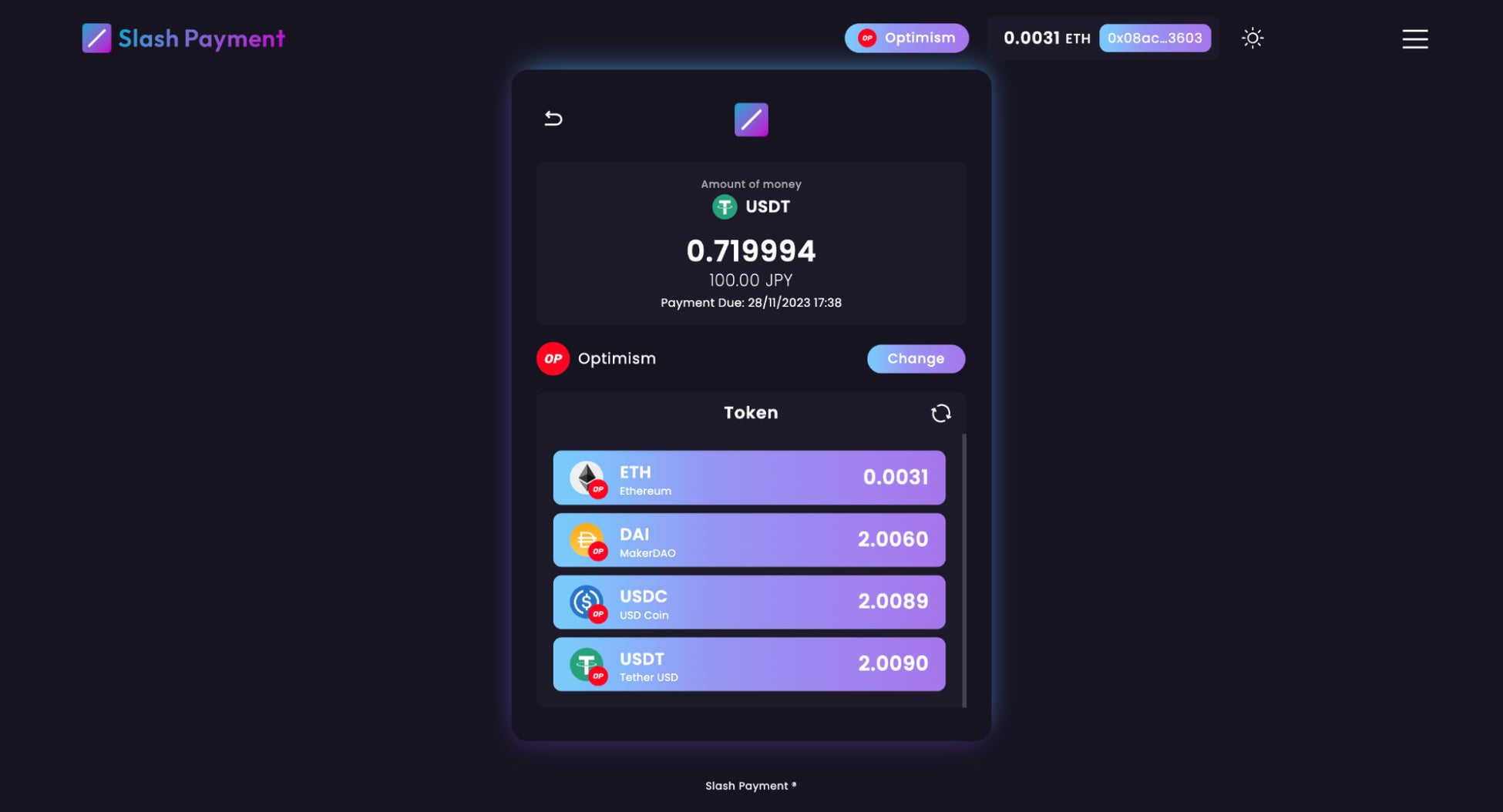 Slash PaymentのOptimism対応により、Optimism上のさまざまなステーブルコイン、ETH、WETHでの決済が可能になりました。※各トークンでの決済に関しても随時対応を検討しております。
