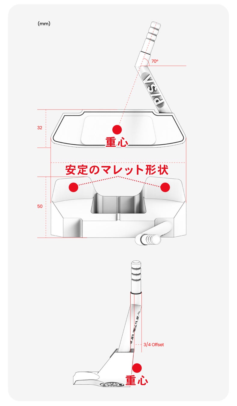強く打ってブレが少ないウエイト内蔵のマレットヘッドを採用しました。