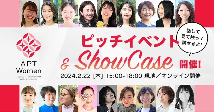 東京都女性ベンチャー成長促進事業「APT Women(読み:アプト ウィメン、Acceleration Program in Tokyo for Womenの略)」は、東京都を起点に世界での活躍を目指す女性起業家や、世の中にお届けする製品・プロダクトに触れていただくイベントとして、2024年2月22日(木)に「ピッチイベント&SHOWCASE」を東京都千代田区の会場で開催します。