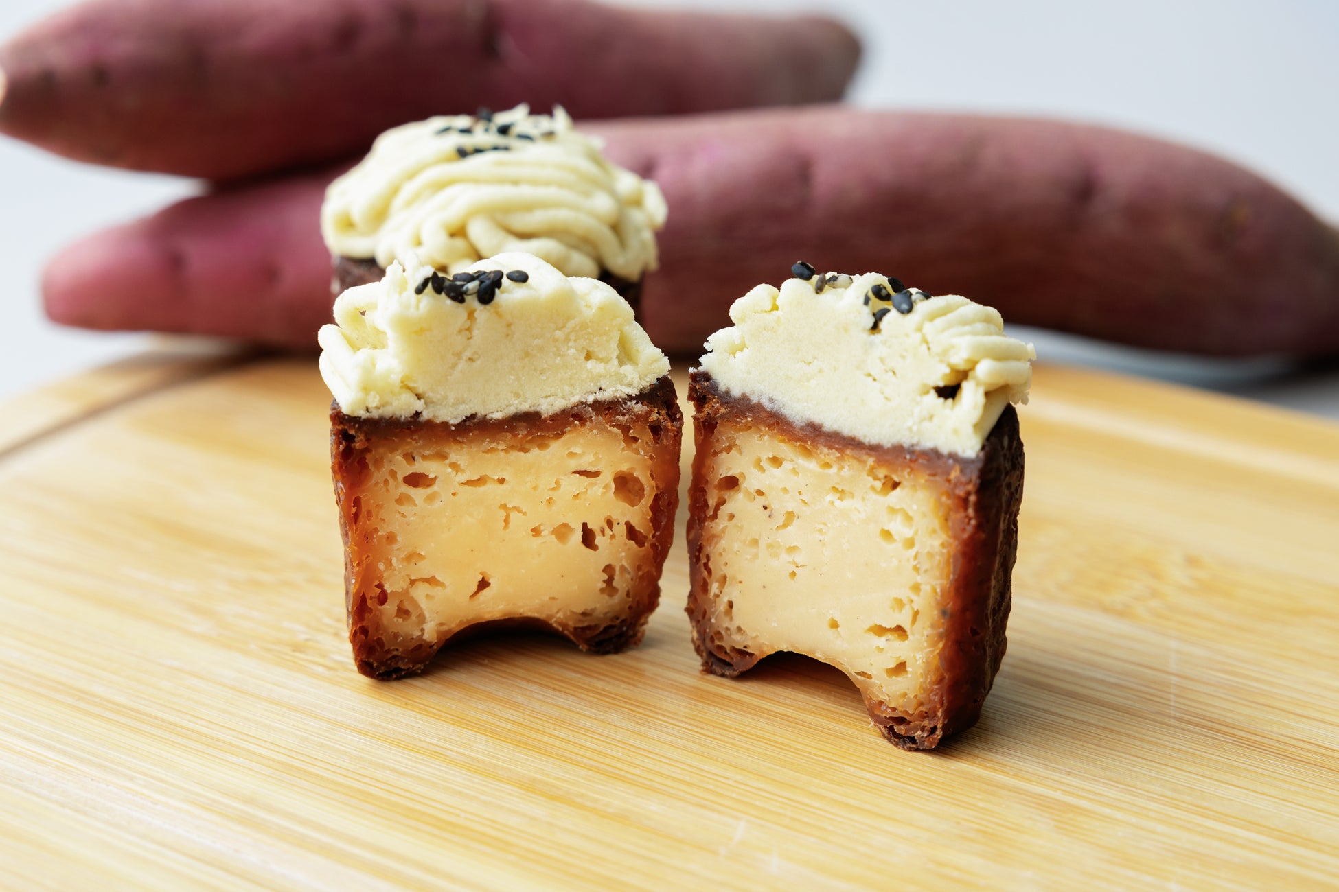 カヌレを逆さにすることで、トッピングできる面積を増やしたホワイトチョコレートクリームの上には、黒ごまも。黒ごまの香ばしさが、濃厚な甘さのさつまいもチョコクリームのアクセントになっており、お芋好きにはたまらないカヌレです。