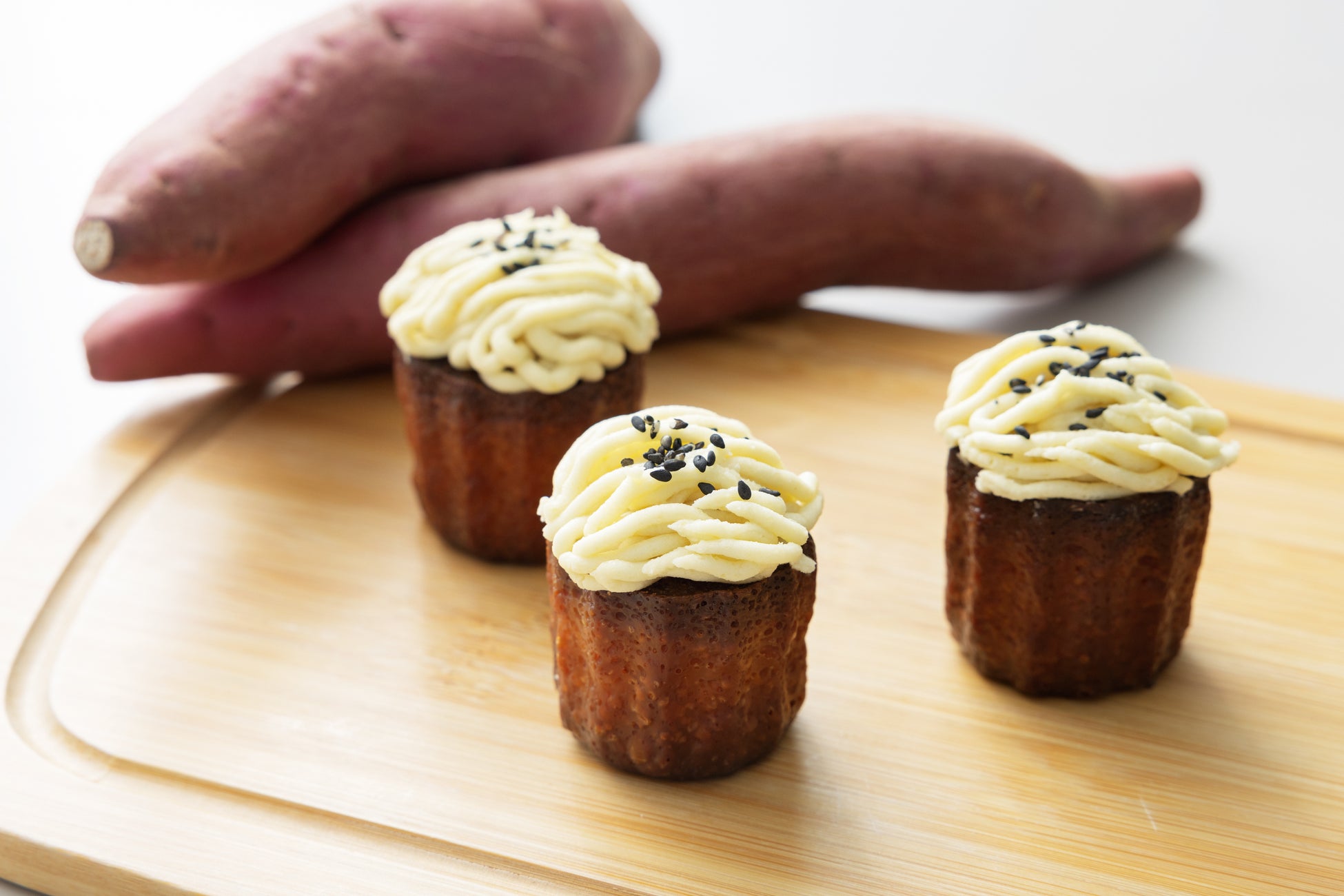 デコレーションに使用されているのは、さつまいも風味のホワイトチョコレートクリーム。さつまいものほくほくとした食感と、ホワイトチョコクリームのなめらかさが合わさって、さつまいもの入った優しい甘さのカヌレと絶妙にマッチします。