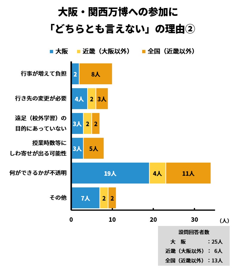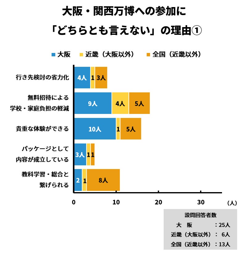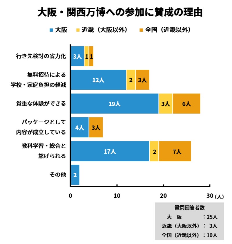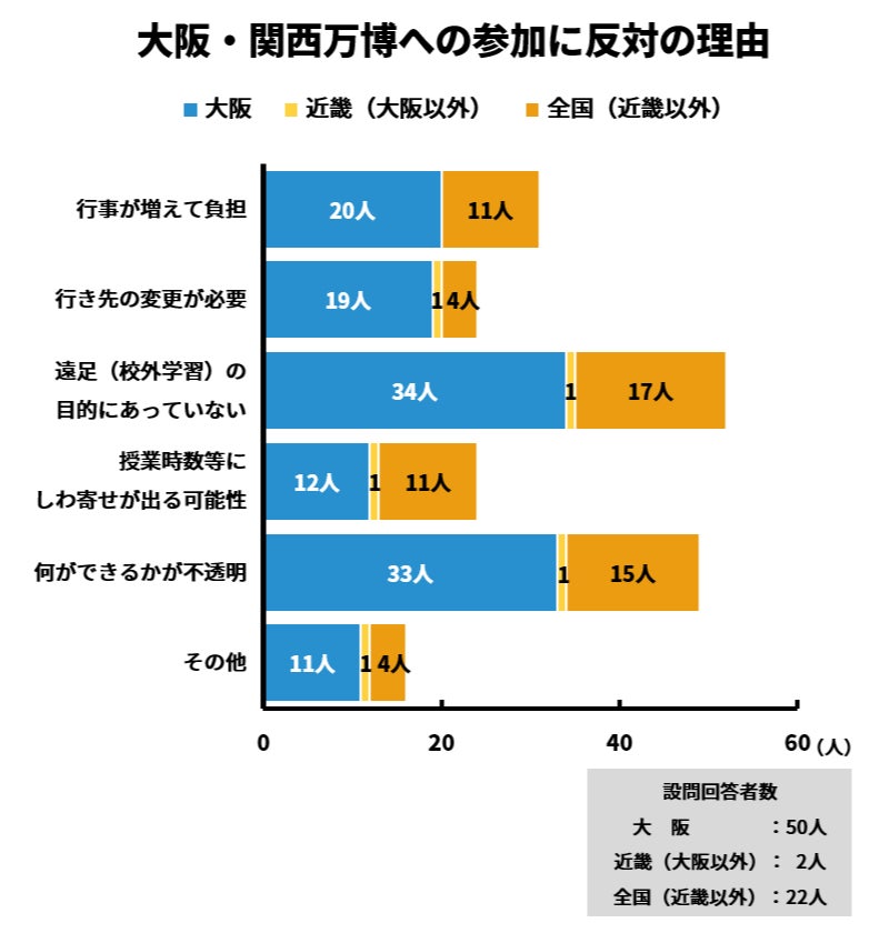 アンケート実施の時点で、「万博そのもの」や「無料招待」の内容(交通費は出るのか、日程調整はどうするのか、下見はできるのか、何を見学・体験できるのかなど)が不透明であることに不安を覚えてる方や、それが分からないから賛成反対の判断がしづらいというも多いようでした。少なくとも、従来、遠足や校外学習、目的、計画、下見、安全配慮などを行なって実施されており、そのプロセスが踏みづらい状況が起きているということは言えそうです。