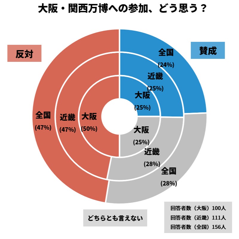 回答者数は、大阪の方が全体の2/3とやはり多くなっているためその点を差し引いて考える必要はありますが、近畿(2府4県)、全国へと回答者の層を広げて見てみても「反対」「賛成」「どちらとも言えない」の比率は大きくは変わりませんでした。