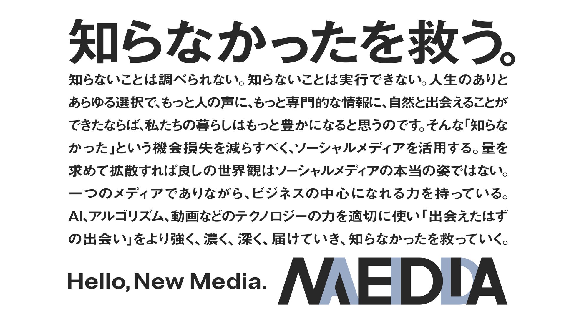 株式会社メディアエイドは、「知らなかったを救う。」というミッションのもと、ソーシャルメディアの力で企業価値を創造する、SNSスタートアップです。現在「ソーシャルメディアをビジネスインフラにする。」というビジョン実現に向けて、SNSソリューション事業、SNSタレント事業、SNSプラットフォーム事業を展開しています。