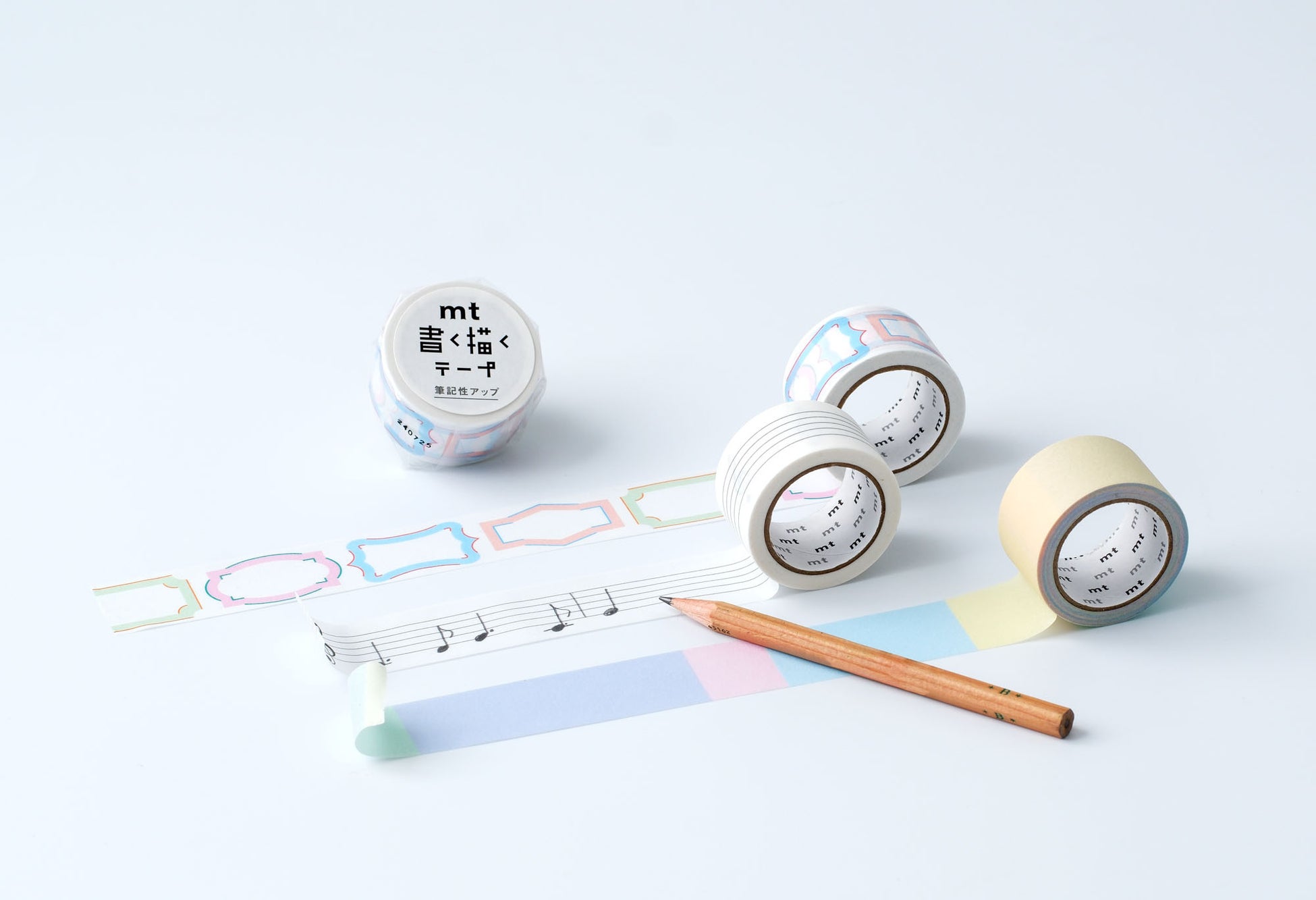 表面に特殊加工を施し、筆記性をUPさせることで、水性ペンや鉛筆などでも文字や絵が書きやすい「mt 書く描く」シリーズ。お客様からの声を活かし、シンプルで使いやすい3柄が新たに加わりました。五線譜デザインのマスキングテープは、市販の五線譜ノートに多いサイズ感で制作しており、譜面の書き換えやメモ書きに便利なアイテムです。ノートなどの紙が傷まないよう、通常のマスキングテープより少し剝がしやすい粘着剤を採用しております。