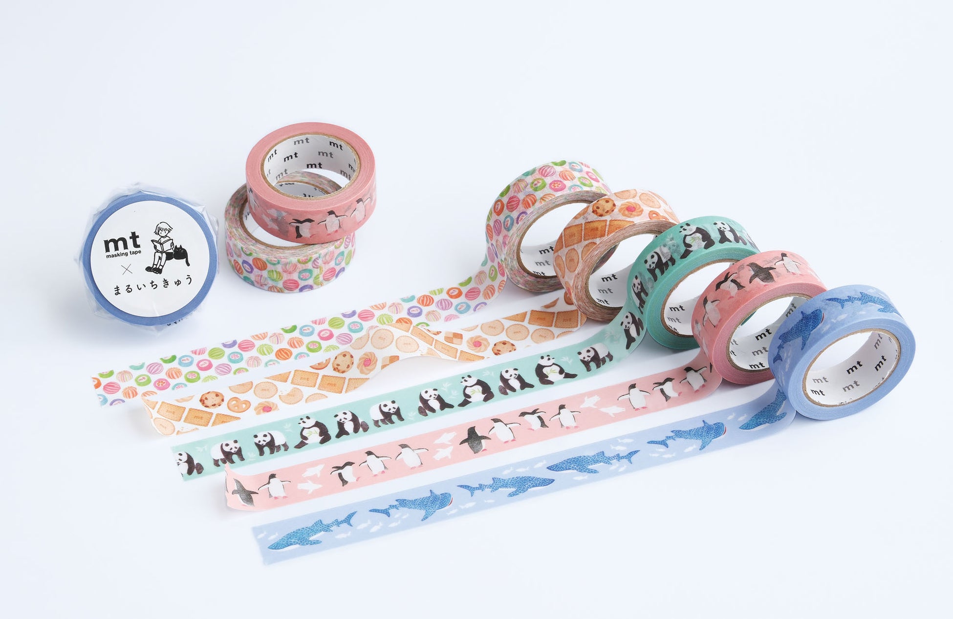 mtイベントでも多くのコラボレーションデザインを手掛ける消しゴムはんこ作家・まるいちきゅうシリーズから5柄がデビュー。パンダ・飴・ジンベイザメのモチーフは、イベント限定アイテムからの復刻デザインです。