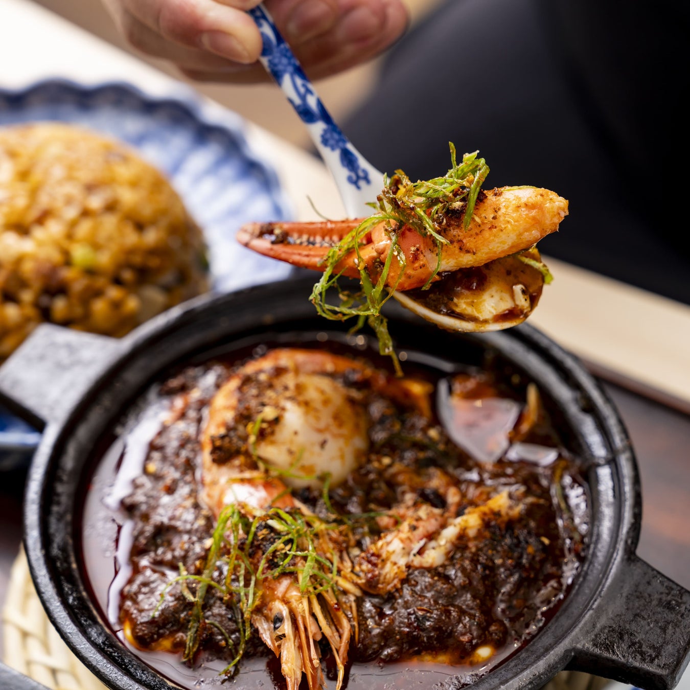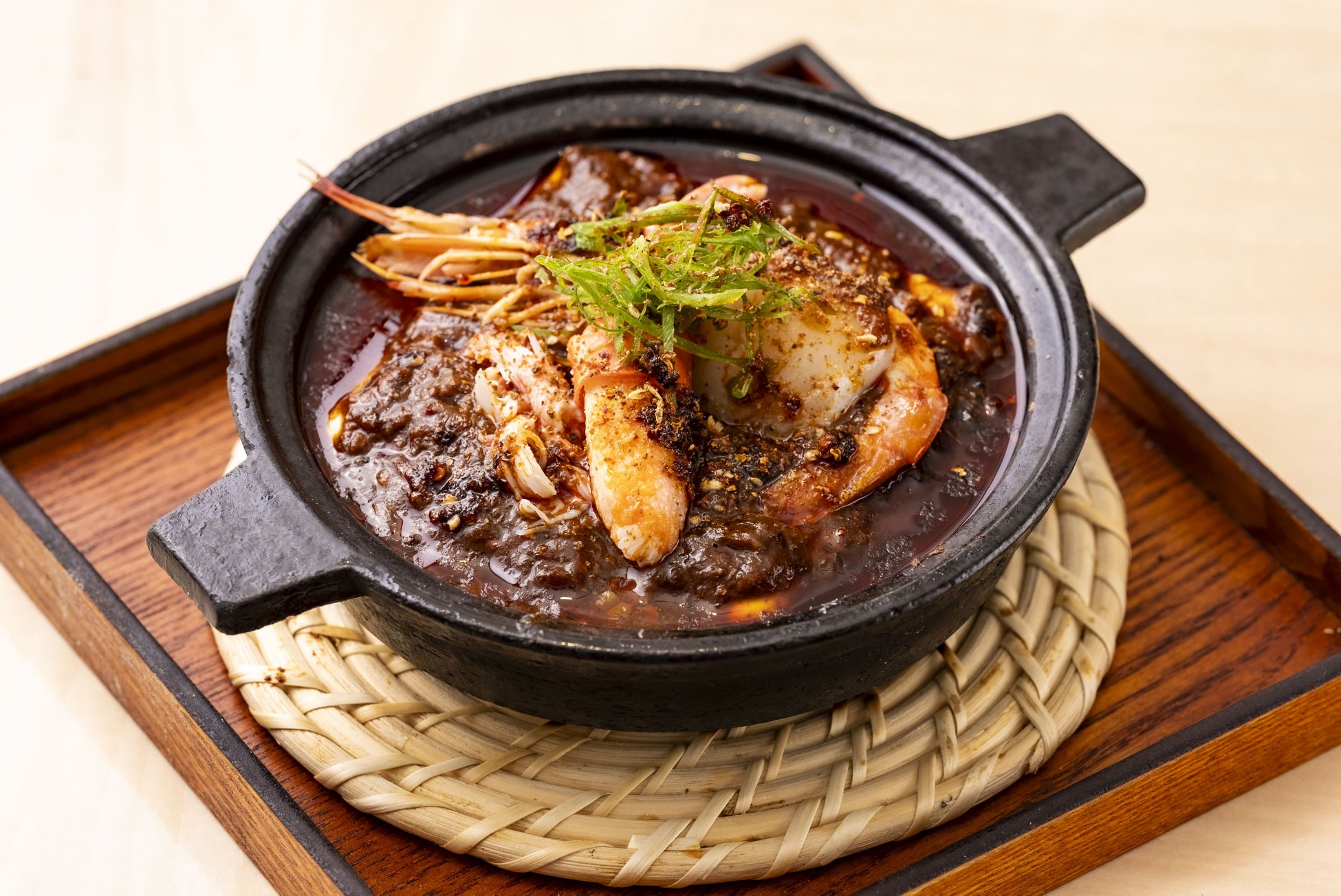 熱々の石鍋で提供される「季節の海鮮麻婆豆腐」は、本格自家製麻婆に、新鮮な海の幸をたっぷりと合わせたこの冬限定メニューです。プリプリのエビとカニが織りなす豊かな旨味に。