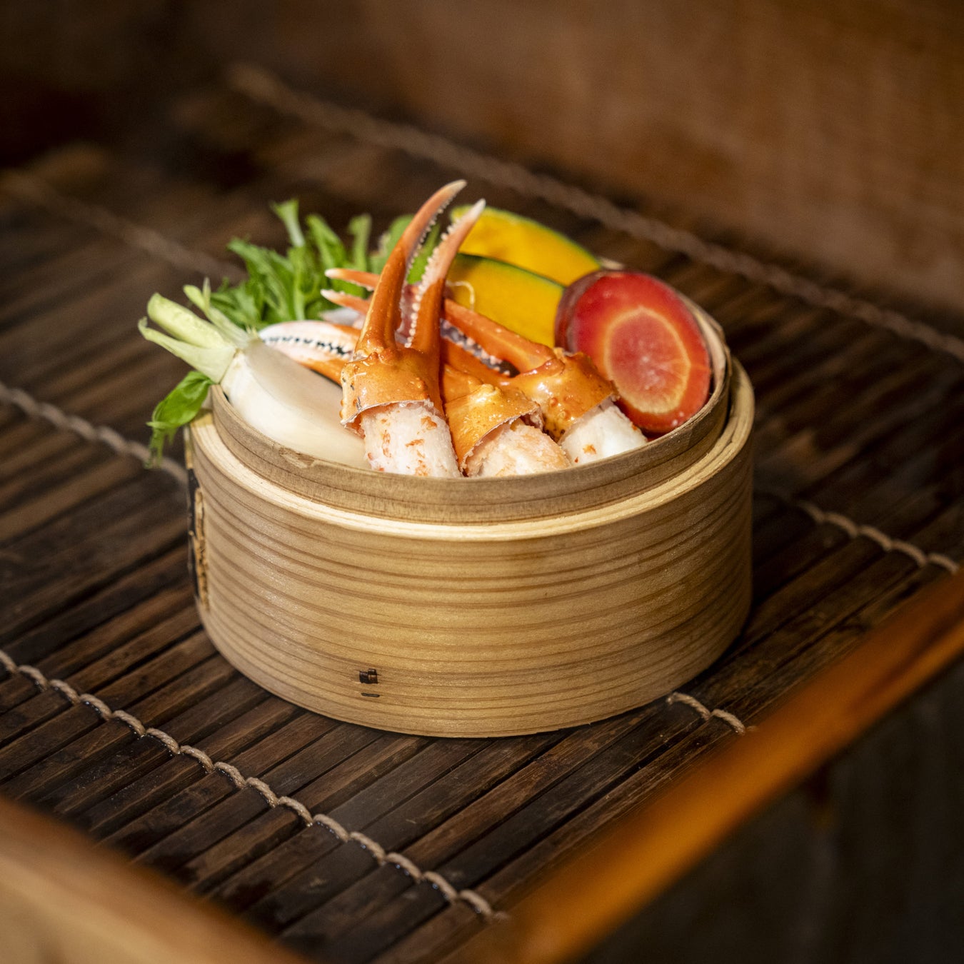 寒い季節にぴったりの「蟹と京野菜のセイロ蒸し」(¥1,280)は、新鮮な蟹の甘みと、彩り豊かな京野菜の旨味を最大限に引き出す一品です。ふんだんに使用した、かぼちゃ、人参、水菜など季節の旬の野菜を蒸し上げることで素材本来の甘さと栄養がギュッと凝縮されています。