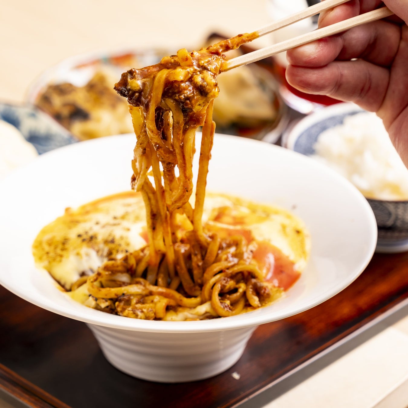 モチモチのうどんに絡む熱々の麻婆ソースと、とろける黄身が食欲をさらに引き立てます。一口ごとに強い旨味を楽しめ、最後まで飽きずに食べることのできる一品です。個性的でありながらもどこかホッとするような味わいを、ぜひお楽しみください。