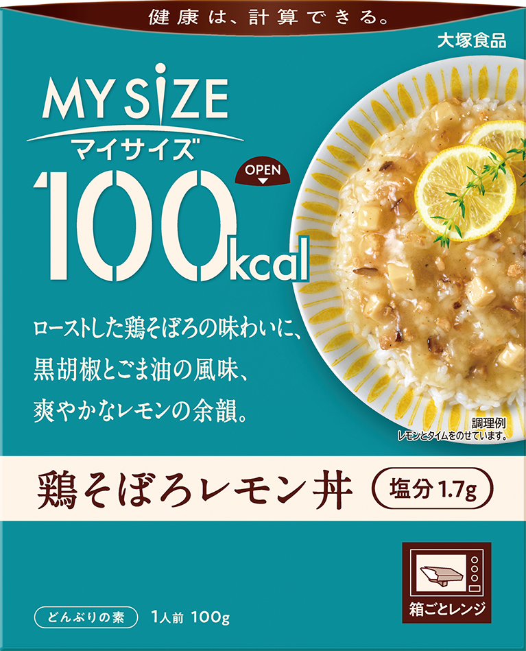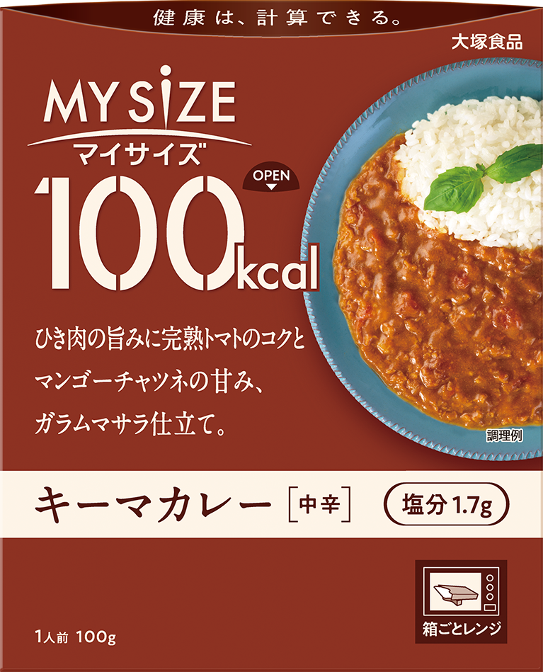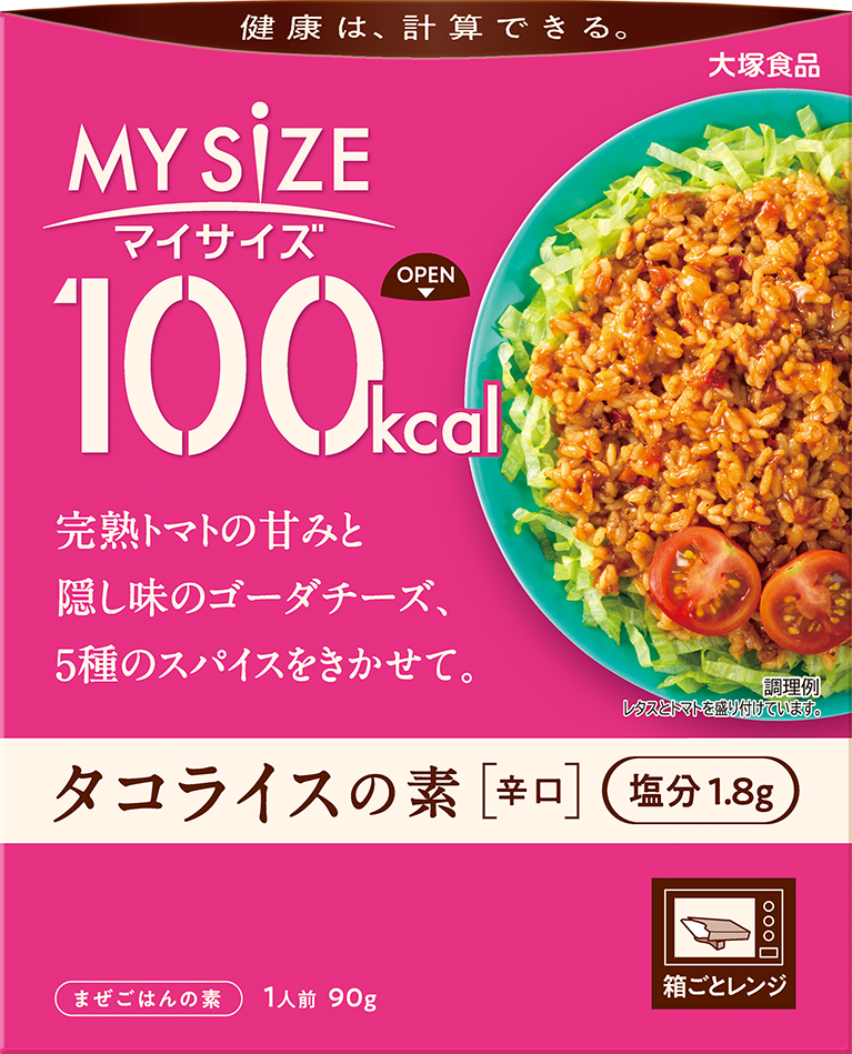 100kcalのレトルト食品を中心に幅広いメニューを展開する『マイサイズ』は、カロリーを分かりやすく表示するだけでなく、1人前当たり塩分2g以下の設計で、おいしくカロリー・塩分コントロールができる製品です。