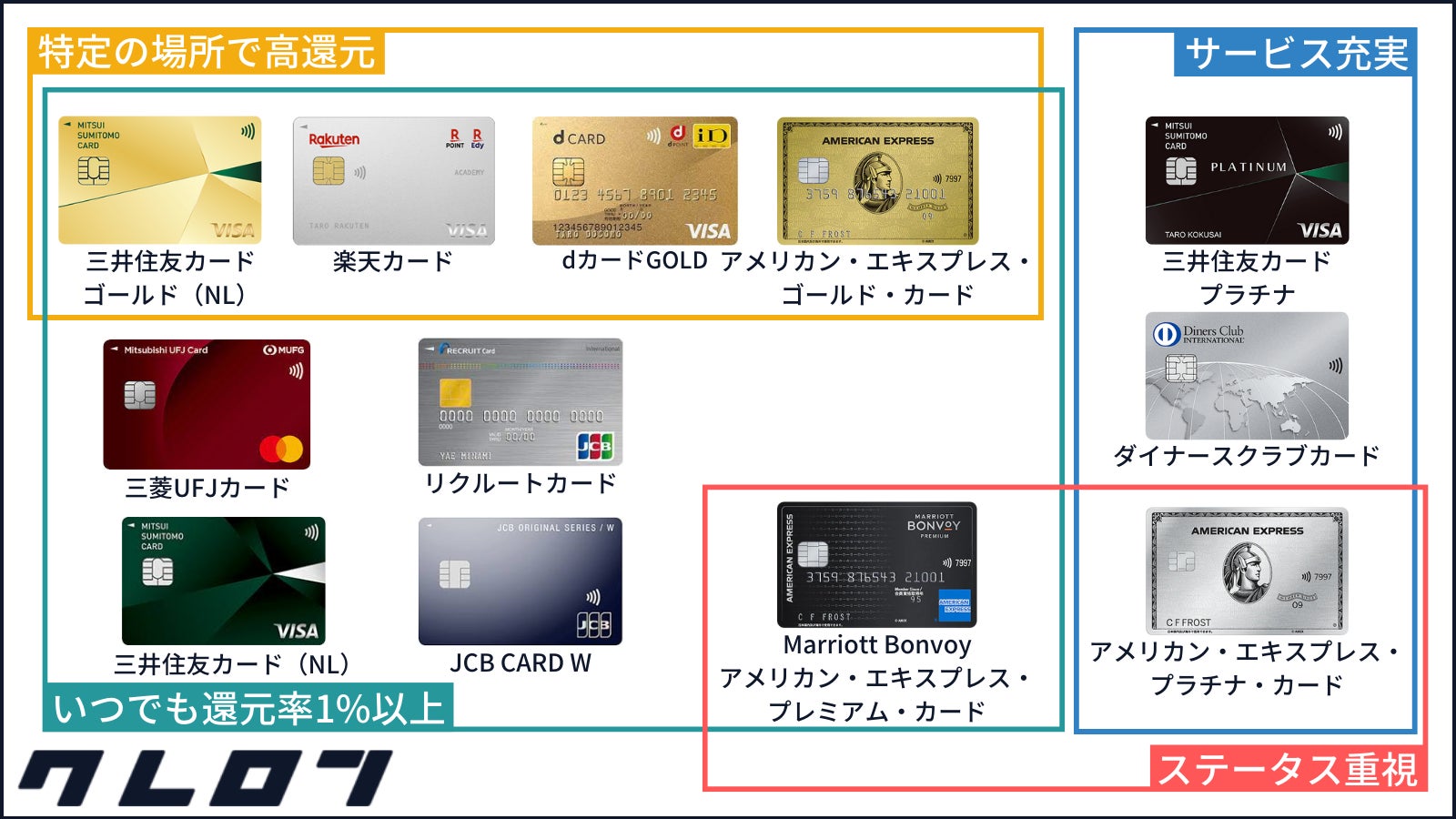 クレジットカードの究極の1枚を、還元率、サービス、ステータスなどの特徴に基づいて分類し、それぞれを掲載しています。