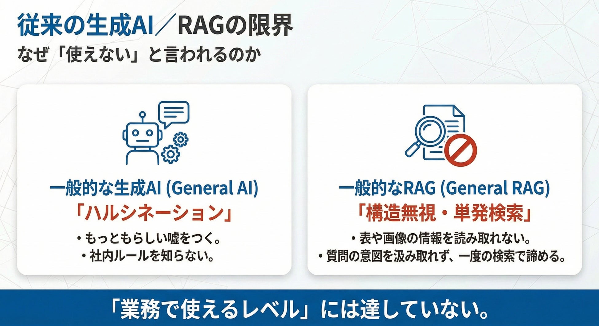 また、従来の生成AIやRAG(検索拡張生成)では、文書構造を正しく理解できず、根拠が不明確な回答となるため、現場で信頼されず定着しないケースが多く見られます。
