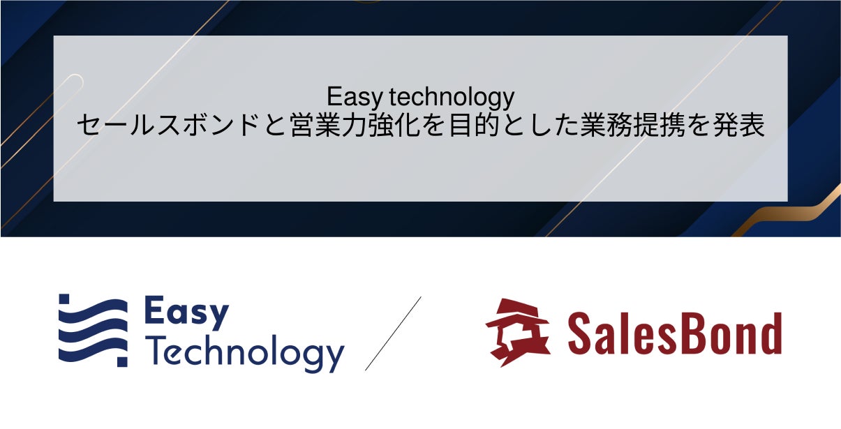 株式会社Easy technology(東京都新宿区、代表取締役:三宅俊也、以下「Easy technology」)は、セールスボンド株式会社(東京都新宿区、代表取締役:飯住孝裕、以下、「セールスボンド」、)と顧客紹介に関する業務提携を締結したことを発表いたします。