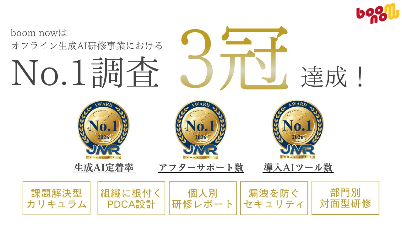 株式会社boom now(本社:東京都豊島区、代表取締役社長:西川勇佑)が提供するオフライン生成AI研修「SHISUKANSU」は、日本マーケティングリサーチ機構による2026年4月期の市場調査において、「生成AI定着率 No.1」「導入AIツール数 No.1」「アフターサポート数 No.1」の3項目でNo.1を獲得しました。
