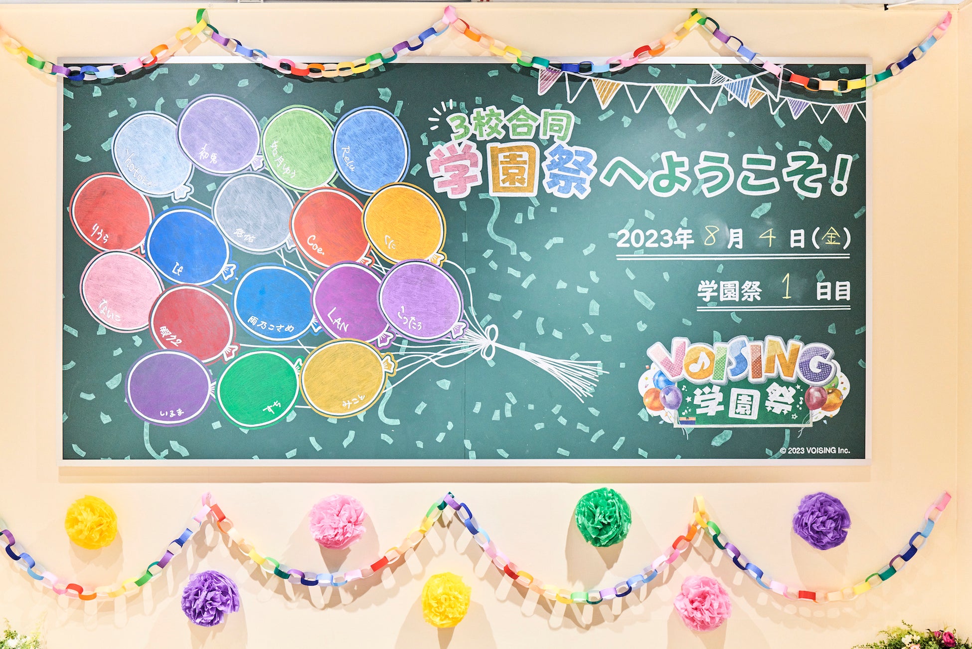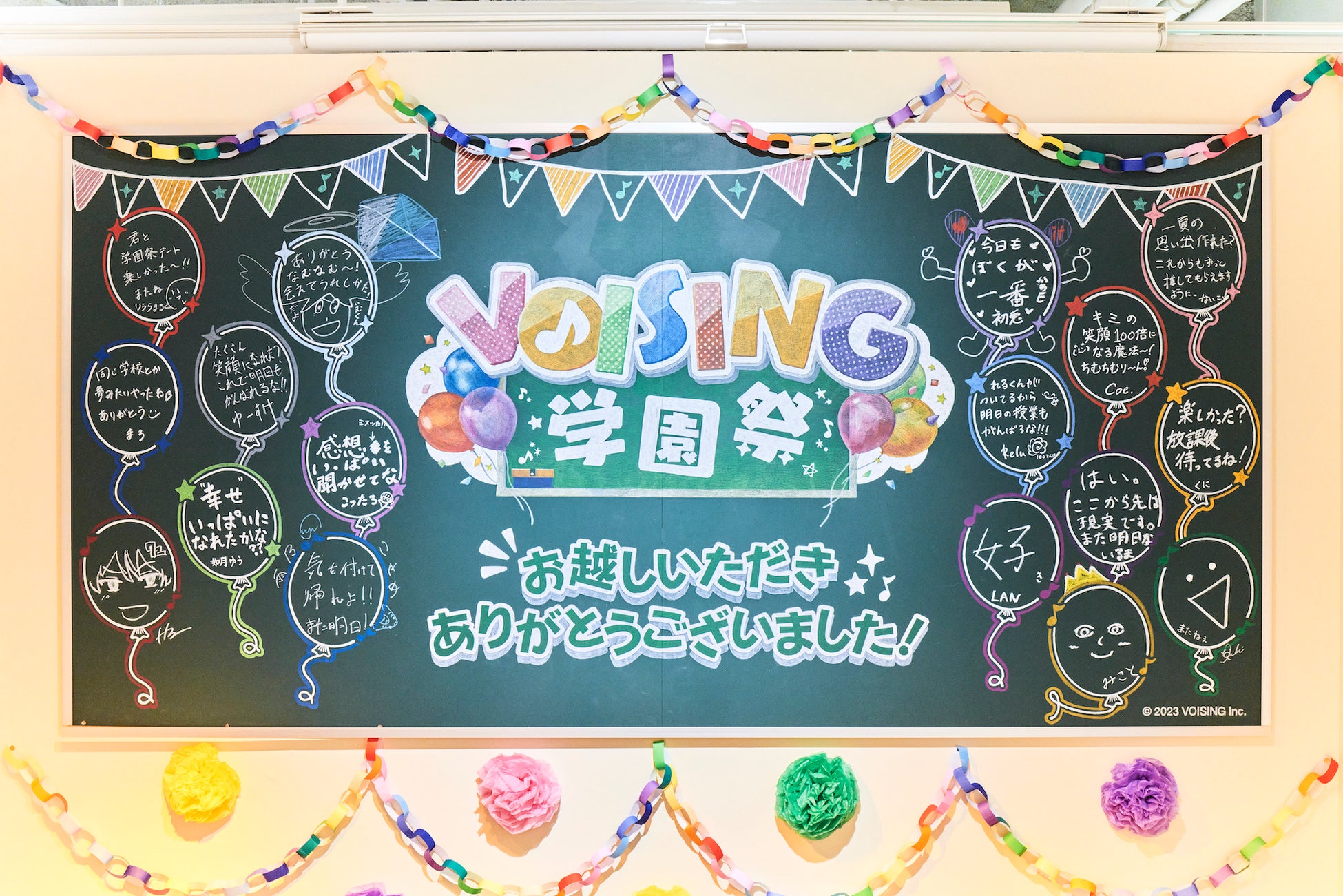 VOISING学園の校門では大きな花のゲートと大きな黒板アートでお出迎え。入り口に入るとすぐにVOISINGメンバーの歓迎メッセージが聞こえてきます。