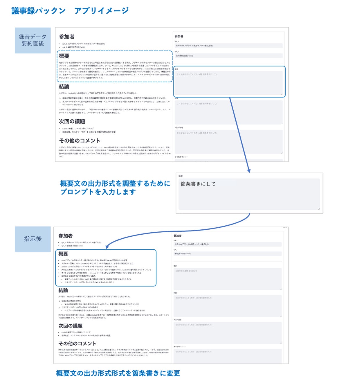 特徴として、一度作成したあともユーザのプロンプト入力に応じた再生成が可能です。これにより、営業担当それぞれに応じたまとめ方への調整や、会議別の重要な観点の追加が可能になり、営業担当の負担を軽減しながらも、より効果的な議事録の生成に貢献します。