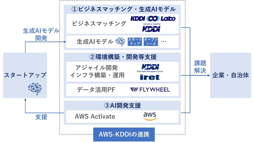 KDDI株式会社(以下 KDDI)とアマゾン ウェブ サービス ジャパン合同会社(以下 AWS)は、生成AIの社会実装の加速に向けて、スタートアップの生成AI開発や企業・自治体での生成AI活用を包括的に支援しています(*2)。