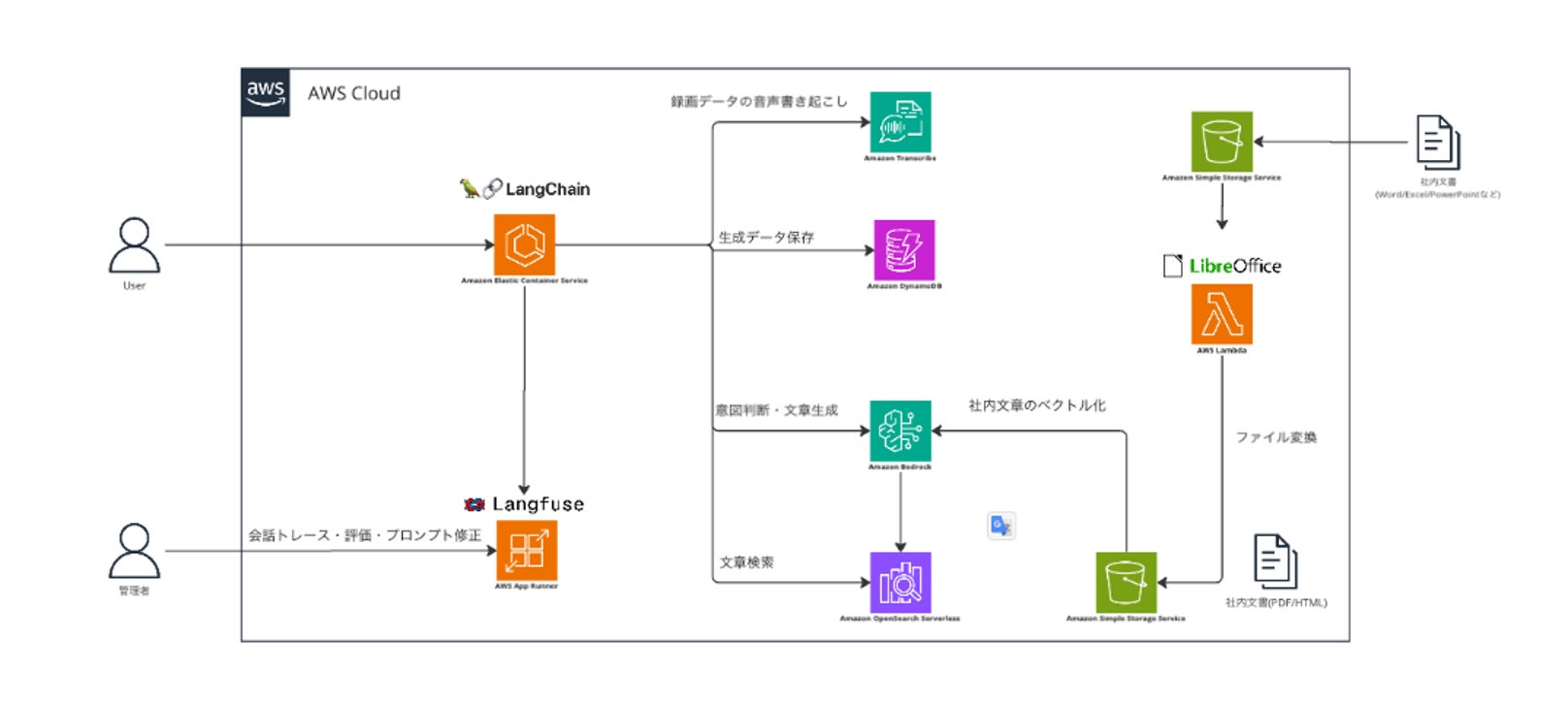 こちらではLangChainにて作成したReACT Agentを用いることで動的に情報の取得を行いました。同エージェントは提案先企業・業界の抽出、企業・業界の最新情報のWeb検索、大量の社内アセット・商材の検索を組み合わせることで、適切な商材提案を行います。社内アセットの検索にはAmazon OpenSearch Serverlessを使用しました。LLMモデルとして利用するBedrock Claude3 Opusの意図判断・日本語生成精度の高さもあり、高品質な提案骨子の作成を実現しました。