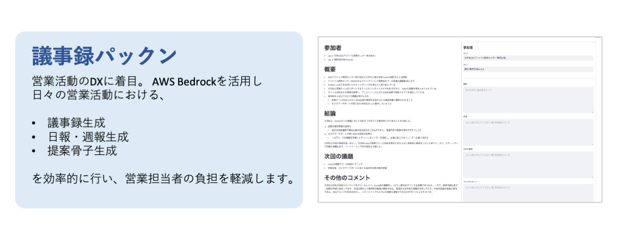 KDDIアジャイル開発センター株式会社(本社:東京都港区、代表取締役社長CEO:木暮 圭一、以下KAG)は、Amazon Bedrock(*1)を活用した営業活動支援ツール「議事録パックン」のPoC開発と評価を行いました。